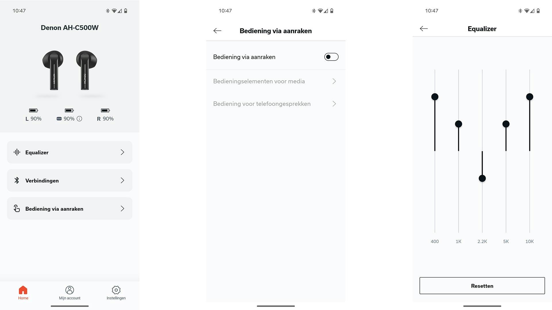 We vinden de bediening op de oortjes sowieso behoorlijk gevoelig, maar gelukkig kun je die uitschakelen via de gratis Denon Headphones-app. Dat hebben wij dan ook gedaan. We hebben ze regelmatig beter in onze oren moeten draaien, omdat ze niet bleven zitten, en hebben daardoor regelmatig onbedoeld functies geactiveerd. Bovendien beschikt de app over een vijfpunts equalizer. Heel handig, want daarmee verbeter je het geluid daadwerkelijk. Helaas kun je je eigen instellingen niet opslaan; als je terug wilt naar oude settings, dan moet je die handmatig invoeren.