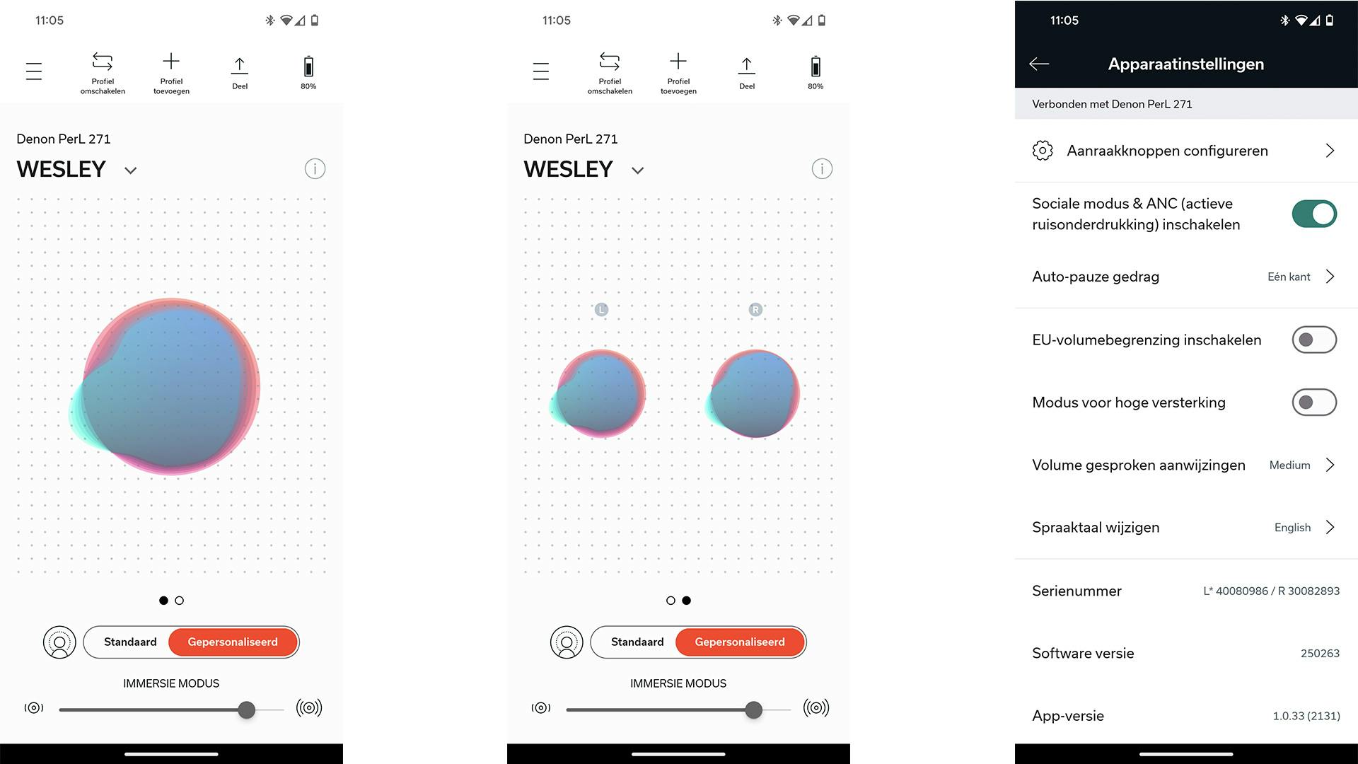 Je regelt de persoonlijke geluidsmodus via de Denon Headphone-app. De app begeleidt je door een volledig geautomatiseerd proces om je ideale geluidsprofiel samen te stellen. Bij andere oordopjes moet je zelf aangeven wanneer je een testtoon hoort, maar bij Denon gaat alles vanzelf zodra je de dopjes in je oren hebt gedaan.