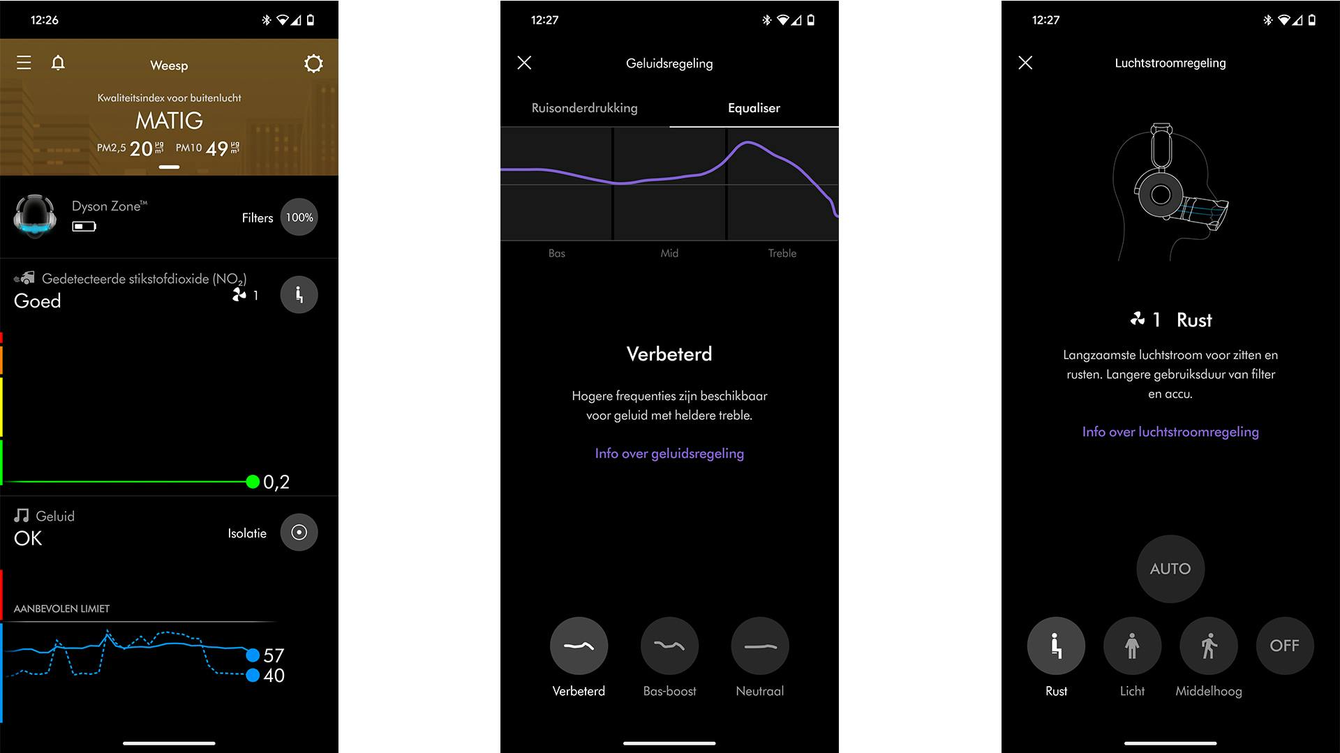 Je zou de equalizer kunnen gebruiken om het een en ander op te vangen, maar helaas biedt dat app-onderdeel geen soelaas. Je hebt maar drie opties tot je beschikking, en kunt verder zelf niet aan de knoppen draaien. Met de basboost kun je het geluid wat warmer laten klinken, maar meer dan dat wordt het niet. Ondanks dat maakt het basgeluid genoeg indruk, maar je merkt dat het wat op de achtergrond zit. Vocalen krijgen bovengemiddeld veel ruimte van de Dyson Zone. Plus, niet geheel onbelangrijk, de actieve ruisonderdrukking beïnvloedt de audiokwaliteit geenszins.