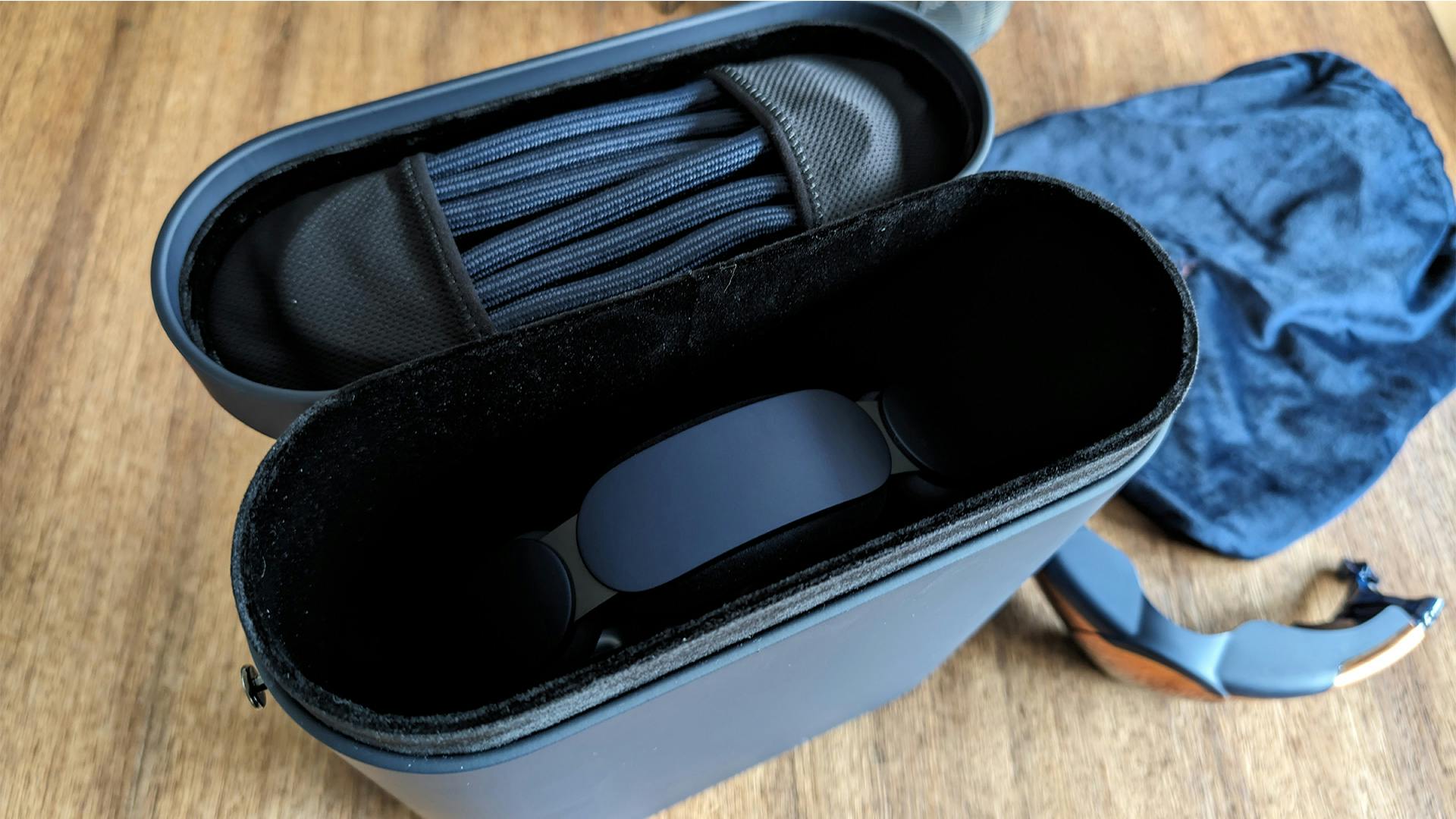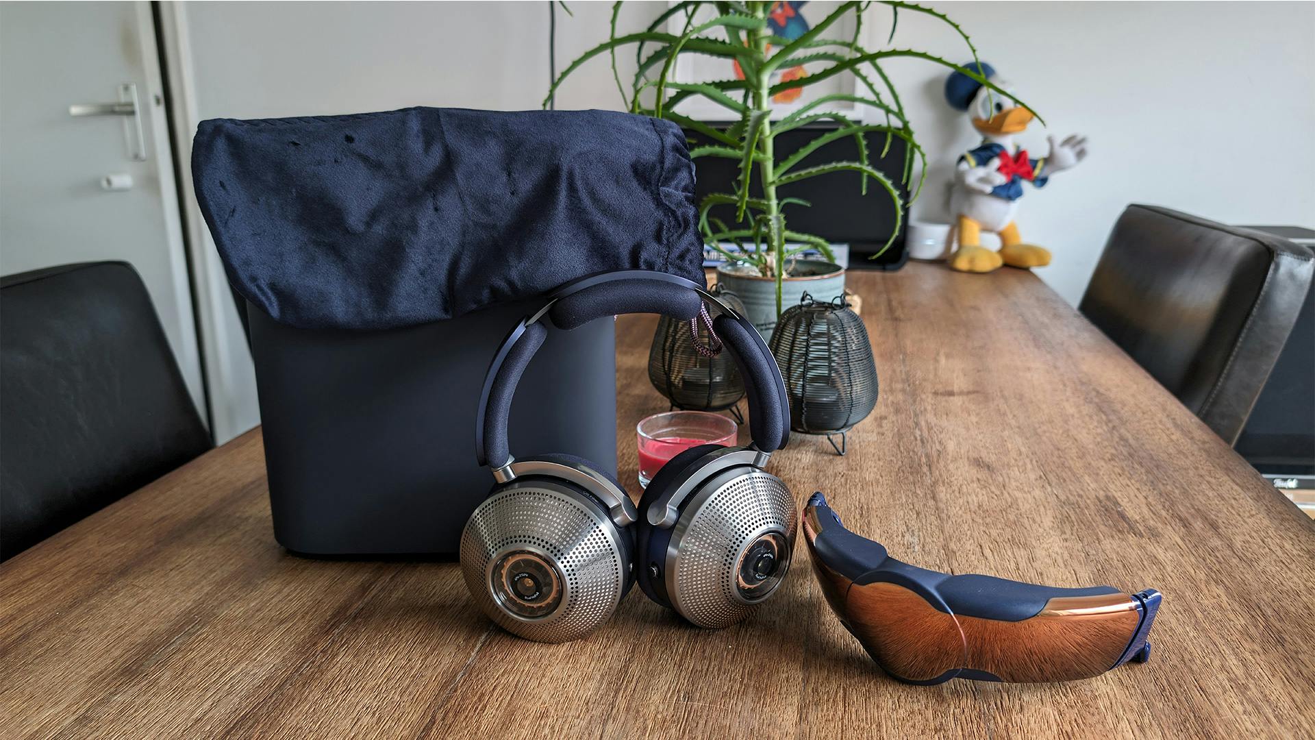 Voor deze recensie testen wij het duurste pakket. Een verschil tussen beide varianten is dat het duurste model een stevige, grote case heeft, waar je de Dyson Zone rechtop in kunt plaatsen om hem te beschermen. Ook is er een adapter voor vliegtuigen aanwezig. Verder zijn beide versies gelijk aan elkaar en krijg je dezelfde koptelefoon met het contactloze vizier. Het complete pakket weegt zo’n 670 gram en dat is veel meer dan een headset gemiddeld weegt. En dat terwijl het gros van het vizier voorop gemaakt is van plastic. Dat extra gewicht is te danken aan het luchtfilteringssysteem.
