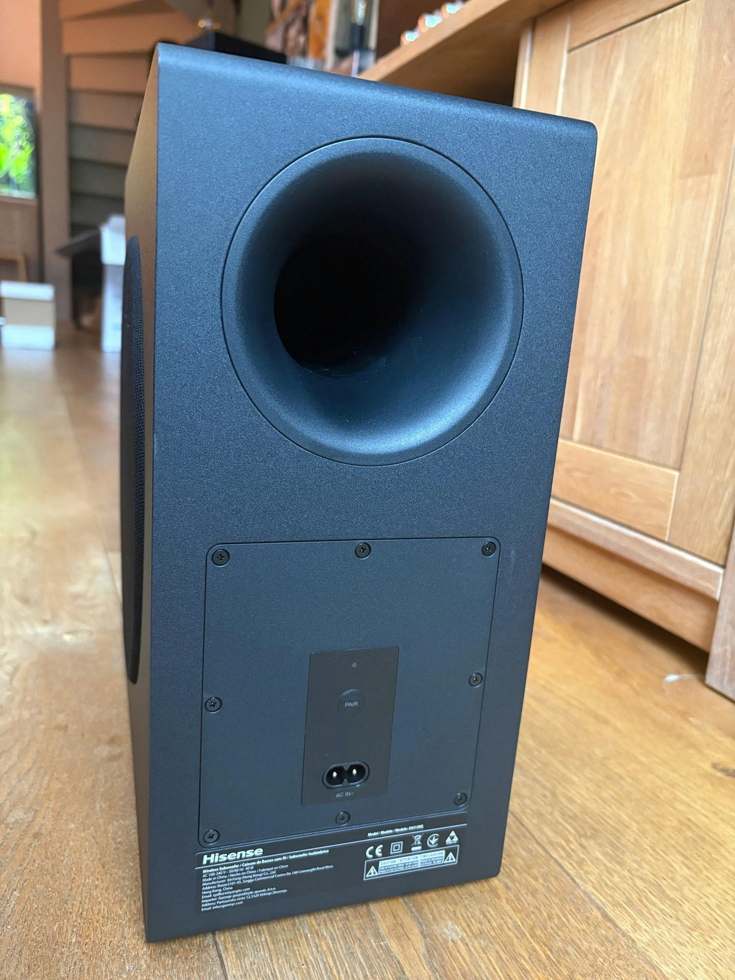 De subwoofer communiceert draadloos met de soundbar. Nadat je beide apparaten op netstroom hebt aangesloten, worden ze automatisch aan elkaar gekoppeld. Lukt dat onverhoopt niet, dan houd je de Pair-knop aan de achterzijde van de subwoofer enige tijd ingedrukt. Je verbindt de AX3120Q via HDMI of de optische ingang met een televisie.