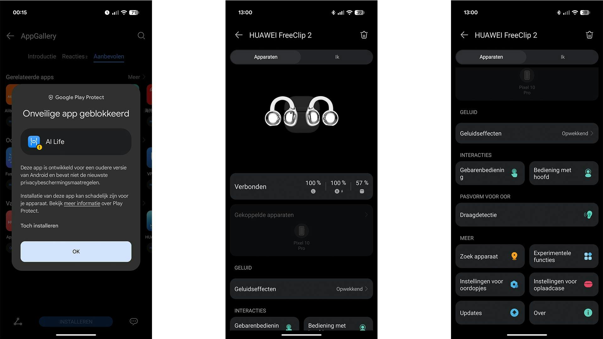 Daarnaast helpt het ook niet dat je voor Huawei-producten apps moet downloaden die niet gewoon in de Google Play Store staan. Je moet eerst AppGallery van Huawei downloaden en vervolgens AI Life installeren. Android geeft zelfs een flinke waarschuwing en dat voelt niet bepaald geruststellend. Ga je toch door, dan krijg je wel een overzichtelijke manier om de Huawei FreeClip 2 te beheren. Aan de app zelf ligt het dus niet.