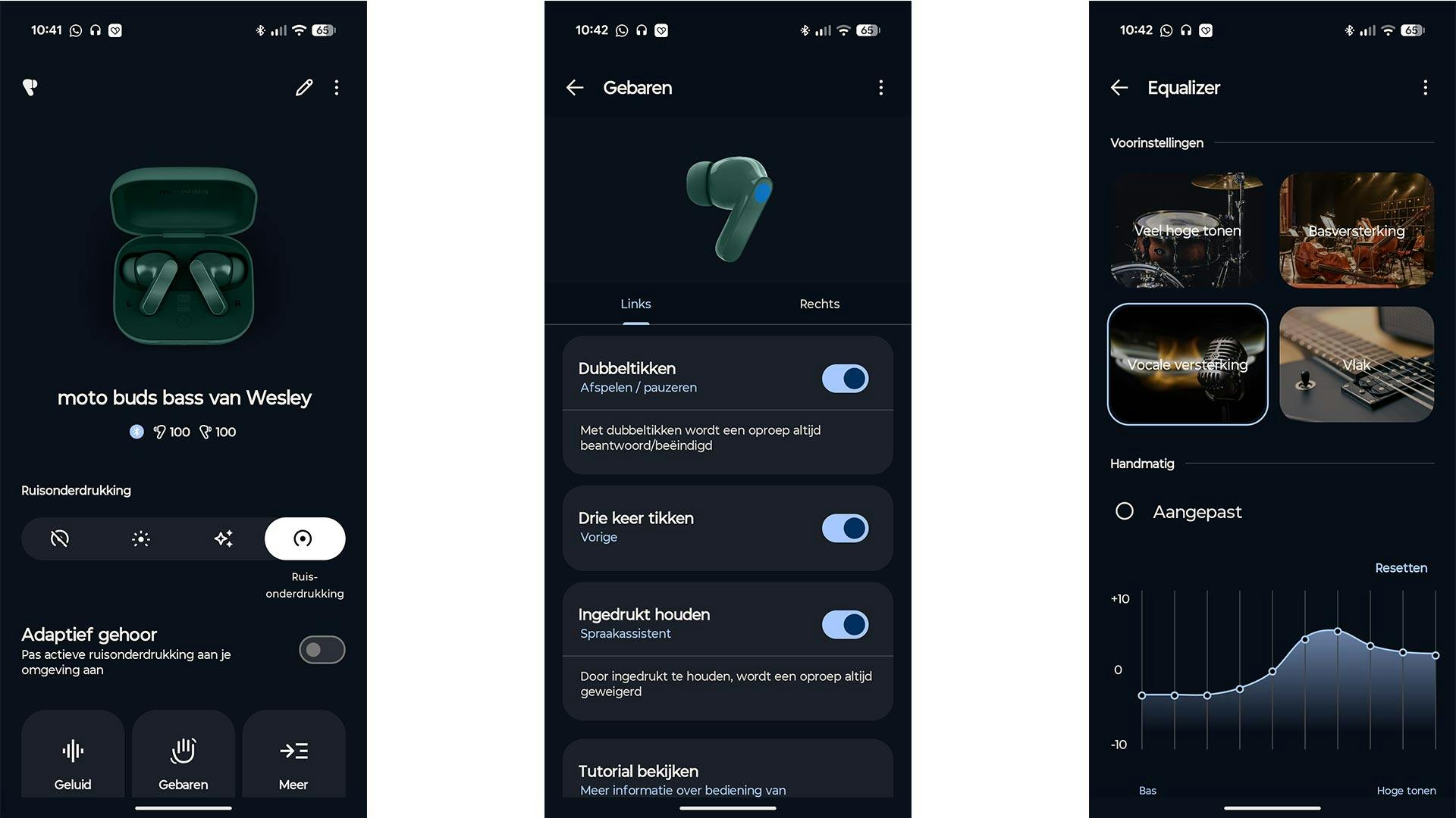 De Moto Buds Bass zijn uitgerust met actieve ruisonderdrukking die omgevingsgeluid merkbaar kan verminderen. In de praktijk filtert de ruisonderdrukking het grootste deel van de monotone geluiden weg, zoals het gezoem van een airco. Daarnaast is er een transparantiemodus, zodat je je omgeving blijft horen. Ook zit er draagdetectie op: haal je een oortje uit, dan pauzeert de muziek automatisch.