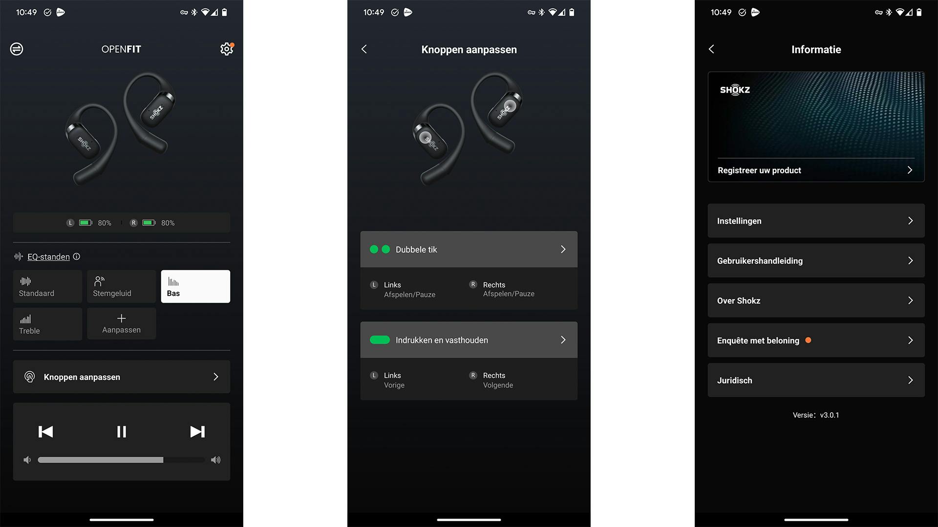 Op de Shokz Openfit-oordoppen zitten aan beide kanten knoppen. Je kunt binnen de gratis en tevens overzichtelijke app instellen wat die knoppen moeten doen. Het bedienen van de aanraakgevoelige omgeving gaat echter onhandig. Je moet de dopjes namelijk vasthouden met twee vingers, terwijl je de actie uitvoert met je duim - want anders schuiven de oordoppen snel van hun plek en moet je ze daarna weer goed positioneren. En aangezien de speakertjes geluid in de gehoorgang sturen en er dus niet in zitten, luistert het behoorlijk nauw allemaal. Voor je het weet lekt er een hoop geluid weg.