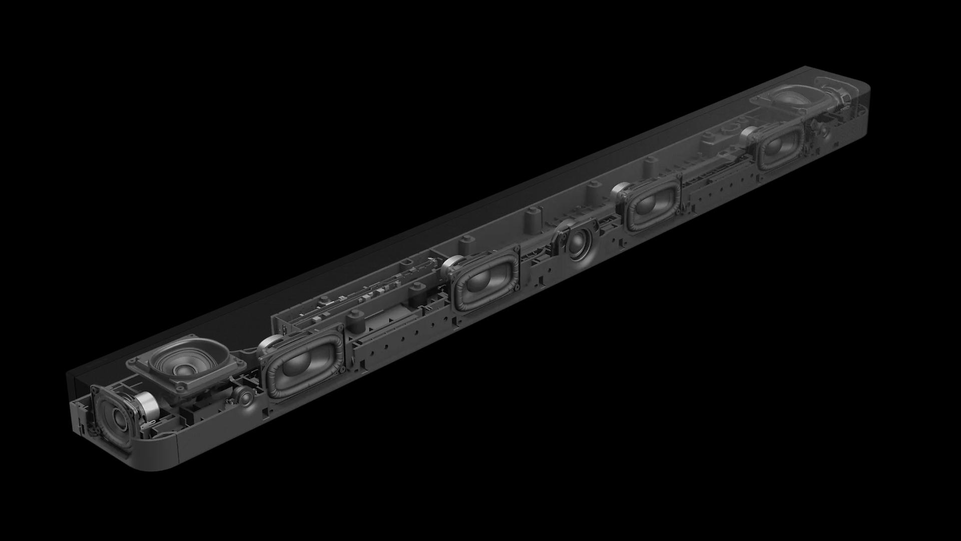 Een verschil tussen de Bravia Theatre Bar 8 en de Bar 9 zit in het aantal speakers: dit kleinere model heeft er elf tegenover dertien in de Bar 9. Beide modellen hebben twee speakers bovenaan die Atmos-geluidseffecten de woonkamer insturen. Je mag deze soundbar dus niet in een kast stoppen of te ver onder de tv schuiven. Aangezien de Bravia Theatre Bar 8 niet geleverd wordt met een aparte subwoofer, zijn er ook twee woofers ingebouwd.