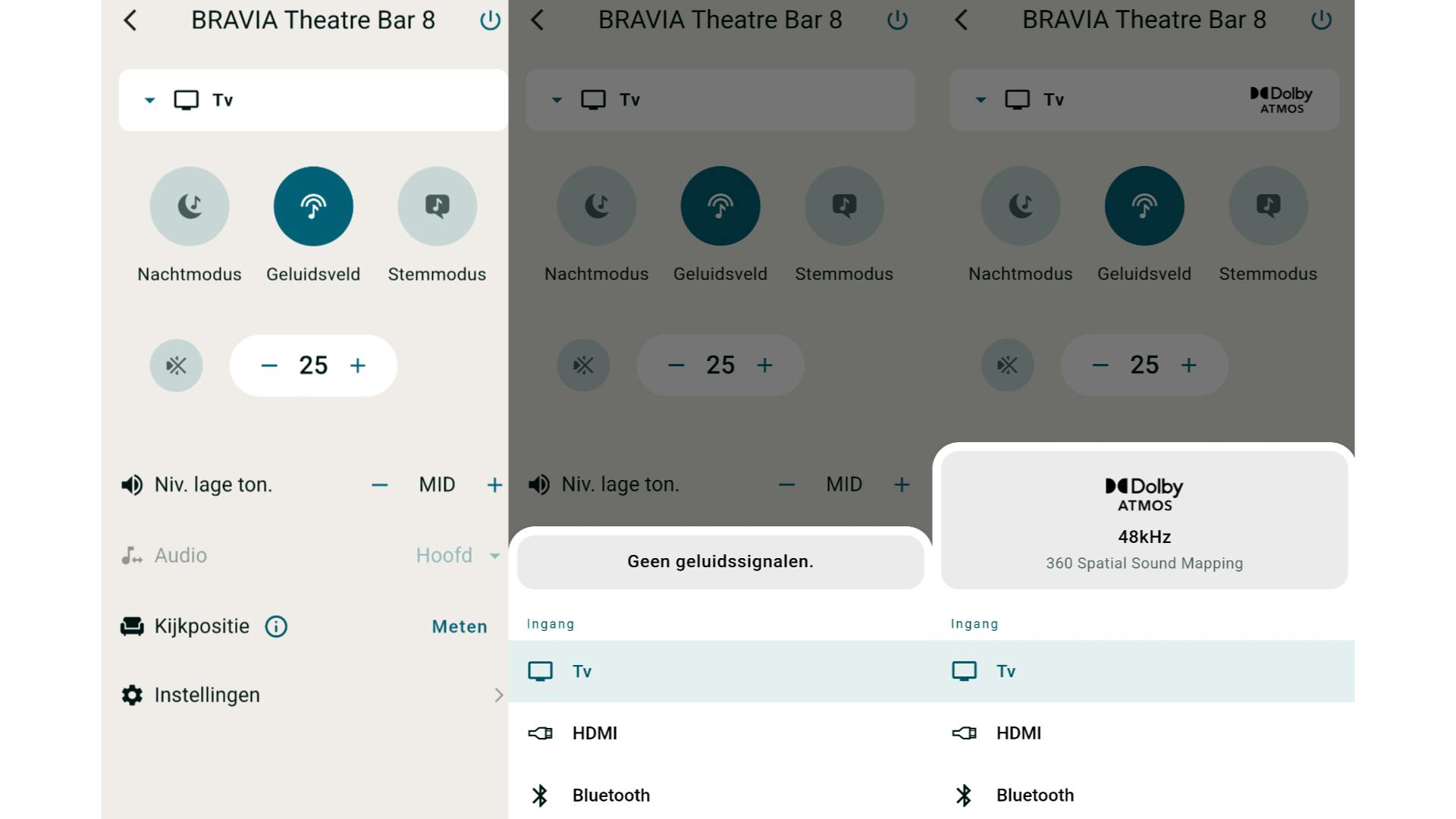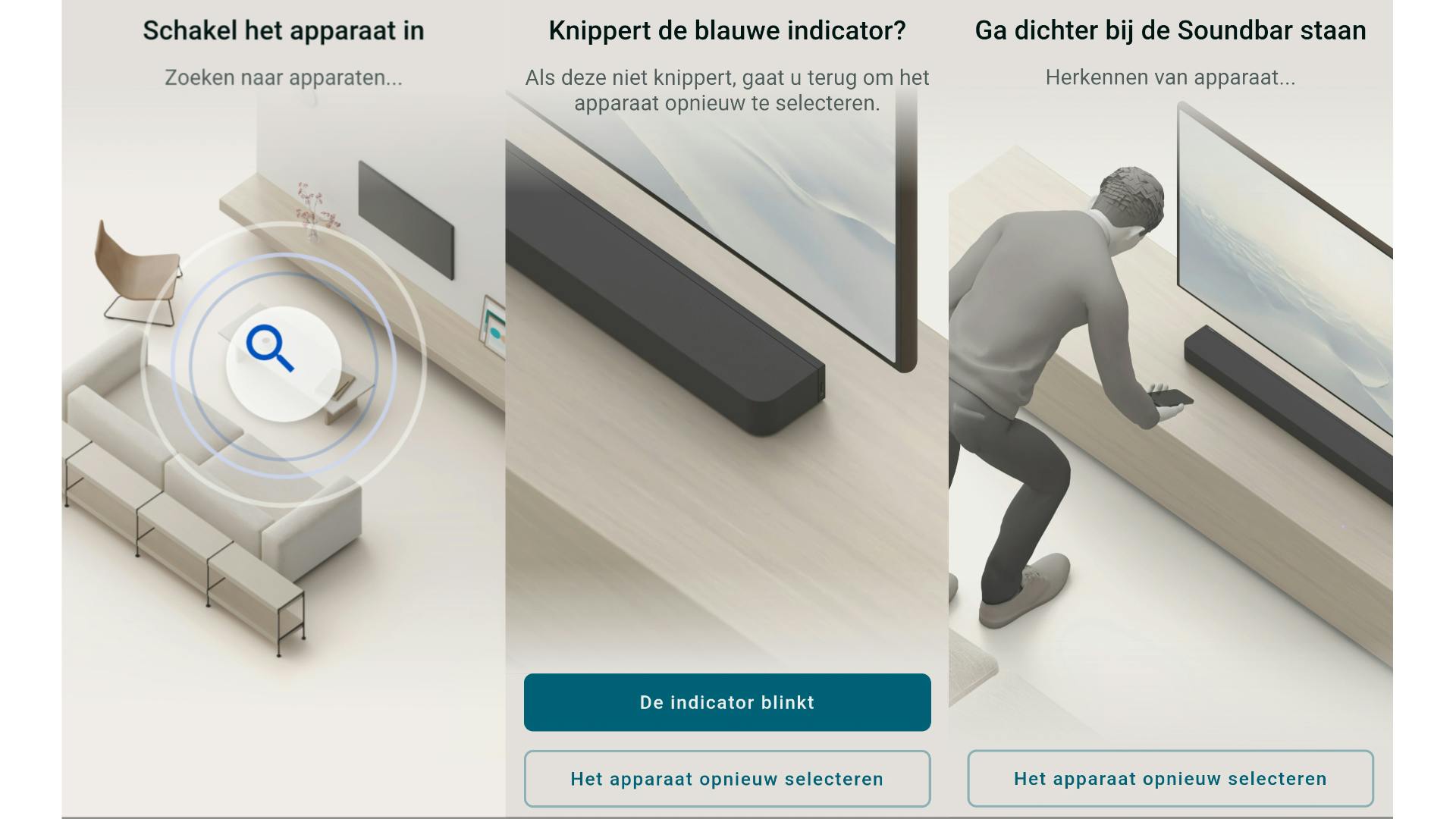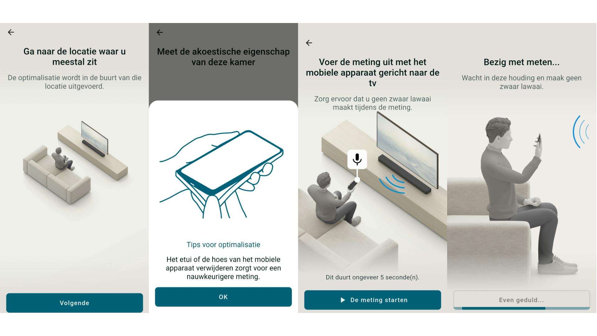 Dat is met name handig als je de metingen uitvoert die horen bij 360 Spatial Sound Mapping en Sound Field Optimization. Zo weet je meteen hoe je je smartphone moet houden terwijl de soundbar korte testgeluidjes produceert. Dit doet je in drie stappen, waarbij je telkens de telefoon anders vasthoudt. Ga je in de hoek zitten, dan kun je via de app snel de laatste meting overdoen.