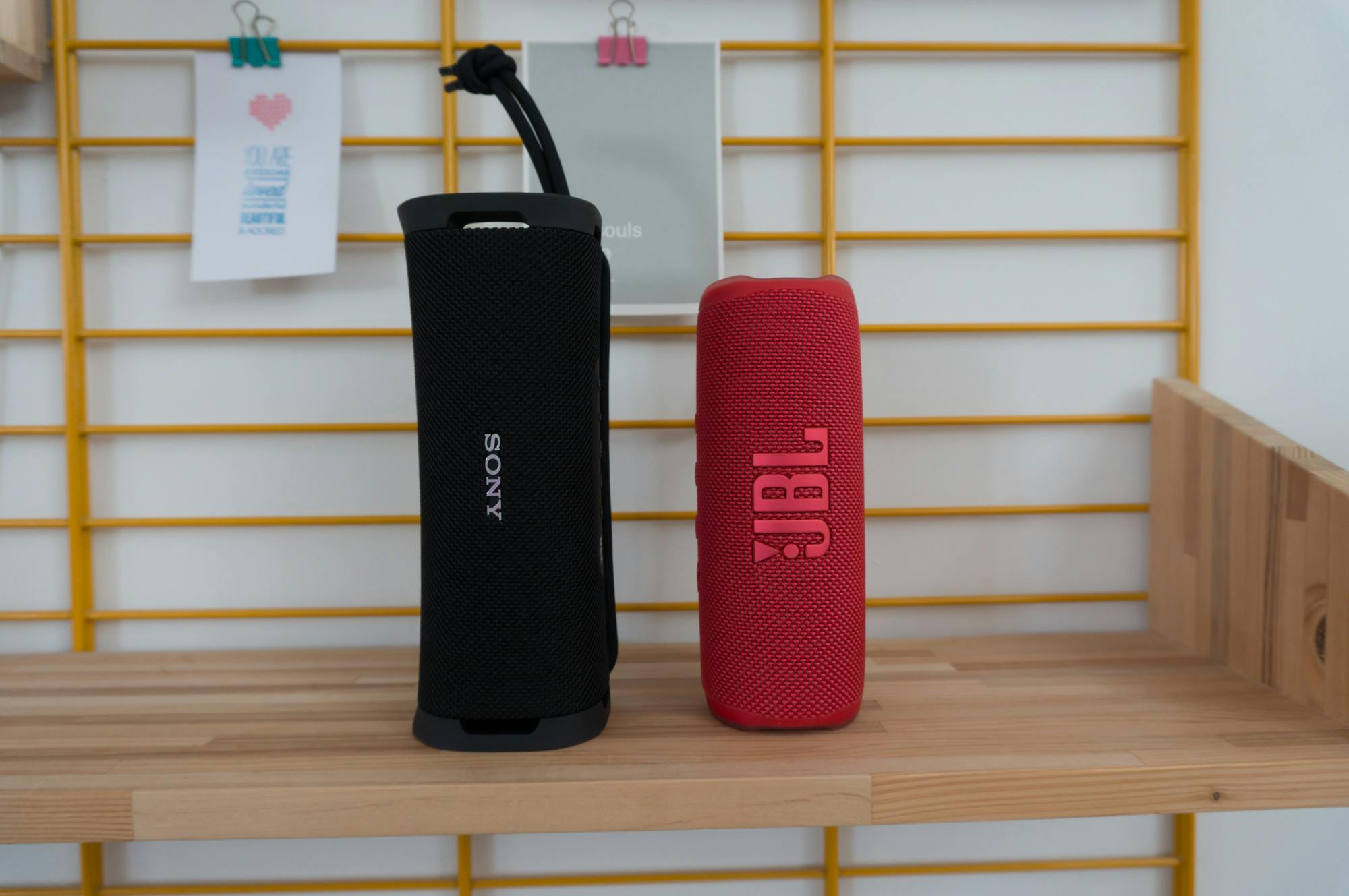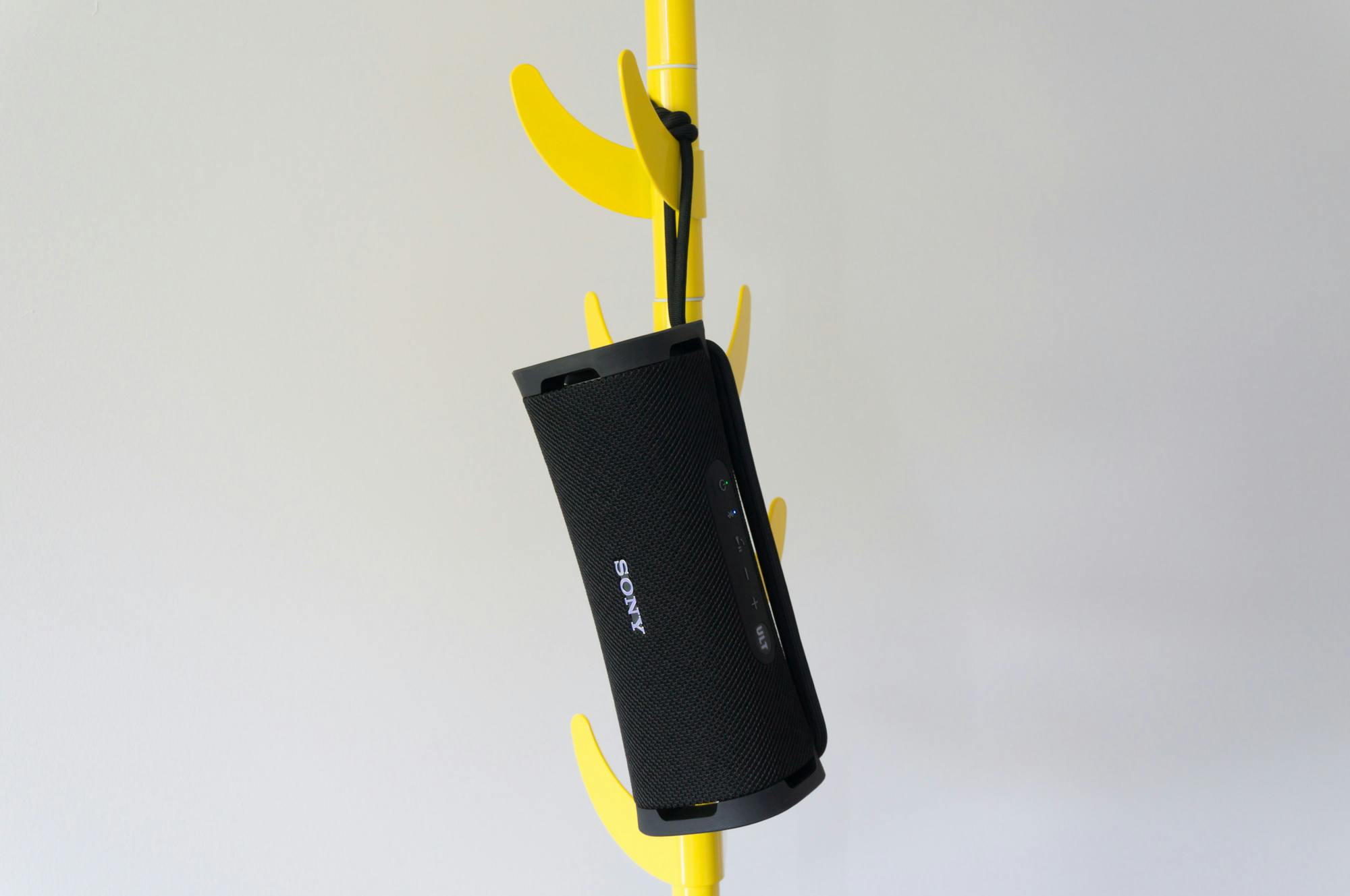 Een bluetoothspeaker is bedoeld om overal te gebruiken en daar heeft Sony goed over nagedacht. Zo heeft de ULT Field 1 een IP67-rating en is hij hiermee stof- en waterbestendig. Je kunt hem dus prima meenemen om muziek te luisteren aan het zwembad of op het strand. Volgens Sony kan hij zelfs tegen zout water en hem schoonmaken met een nat doekje is ook geen probleem. Het meenemen zelf is eenvoudig omdat Sony de behuizing heeft voorzien van een stevig koord dat je kunt gebruiken om de Field 1 ergens aan te hangen of vast te houden. Je kunt het koord verstellen door eraan te trekken, wel gaat dat wat stroef. De cilindervormige behuizing heeft nog een handigheidje, want de speaker past hiermee in de fleshouder van de meeste rugzakken. Al gaat dat helaas wel wat moeilijker dan bij de net wat slankere Flip 6, die daardoor nog net iets makkelijker is om mee te nemen.