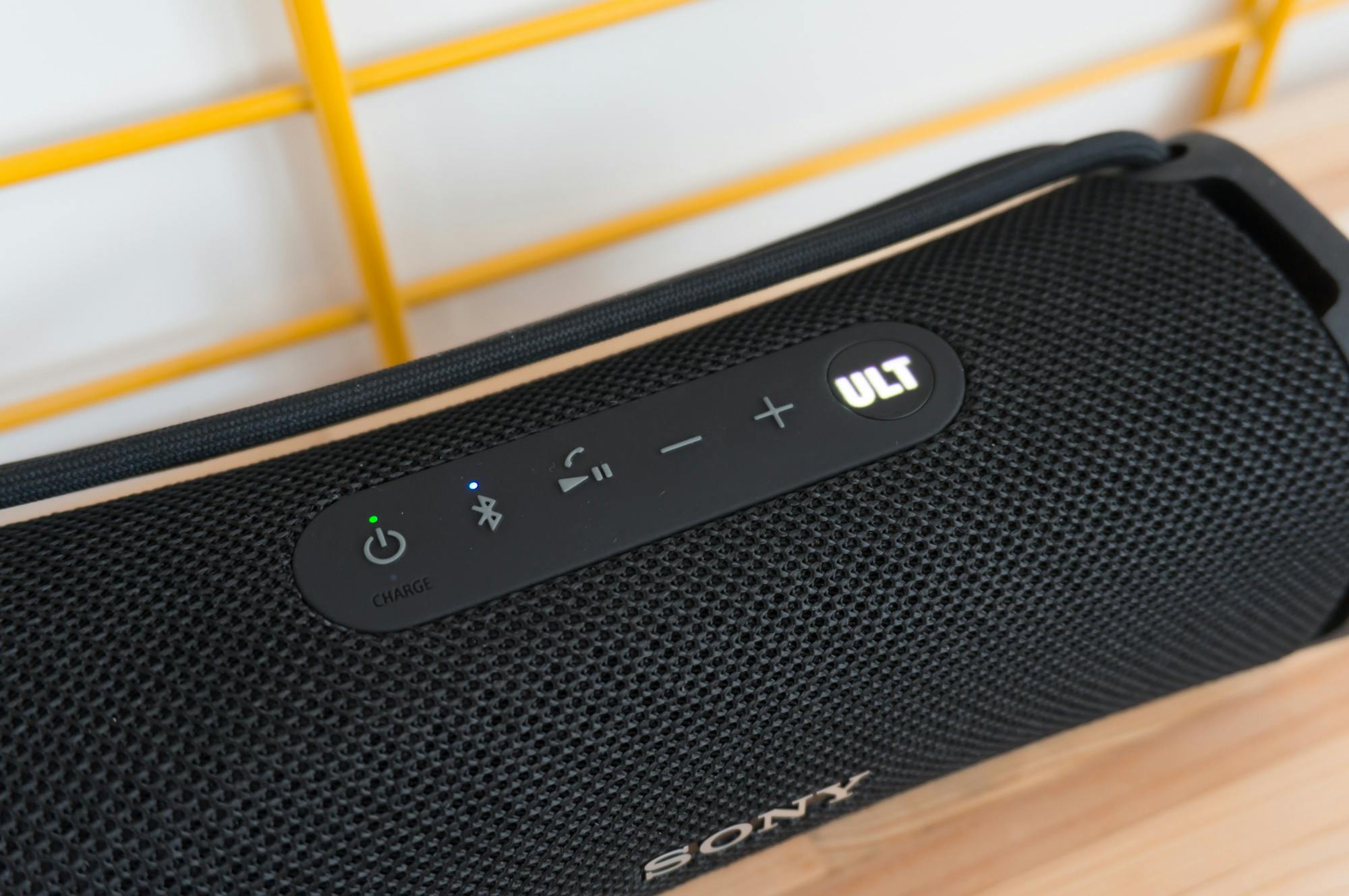 Op de bovenkant heeft Sony de bedieningsknoppen in een strook van silicone-achtig materiaal verwerkt. De zes knopjes hebben een lekkere duidelijke klik. De aan-uitschakelaar is voorzien van een ledje dat aangeeft of de speaker aanstaat en een ledje dat aangeeft of er wordt opgeladen. Het pairingsknopje is voorzien van een blauw ledje om aan te geven dat er een verbinding is. De ronde ULT-knop die de geluidsmodus met extra bas activeert, is voorzien van verlichting die aangeeft dat de functie actief is.