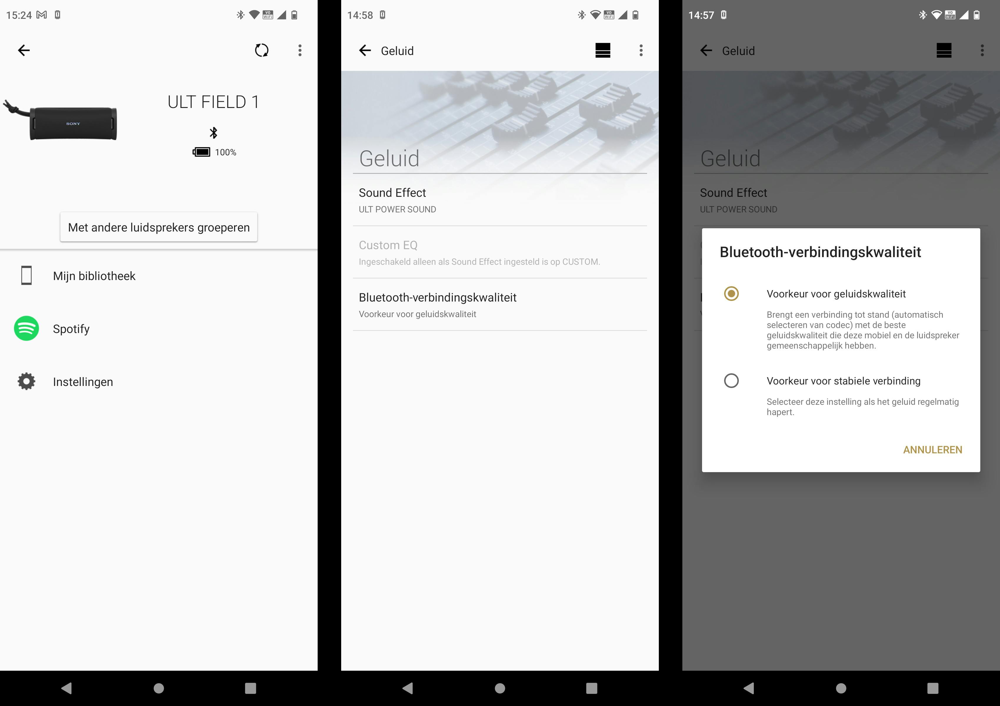 In de app kun je eventueel in de bluetoothinstellingen kiezen voor een voorkeur voor geluidskwaliteit en een voorkeur voor een stabiele verbinding. Standaard is de beste geluidskwaliteit actief en zal de speaker verbinden met de beste codec die door zowel je smartphone als speaker ondersteund wordt.