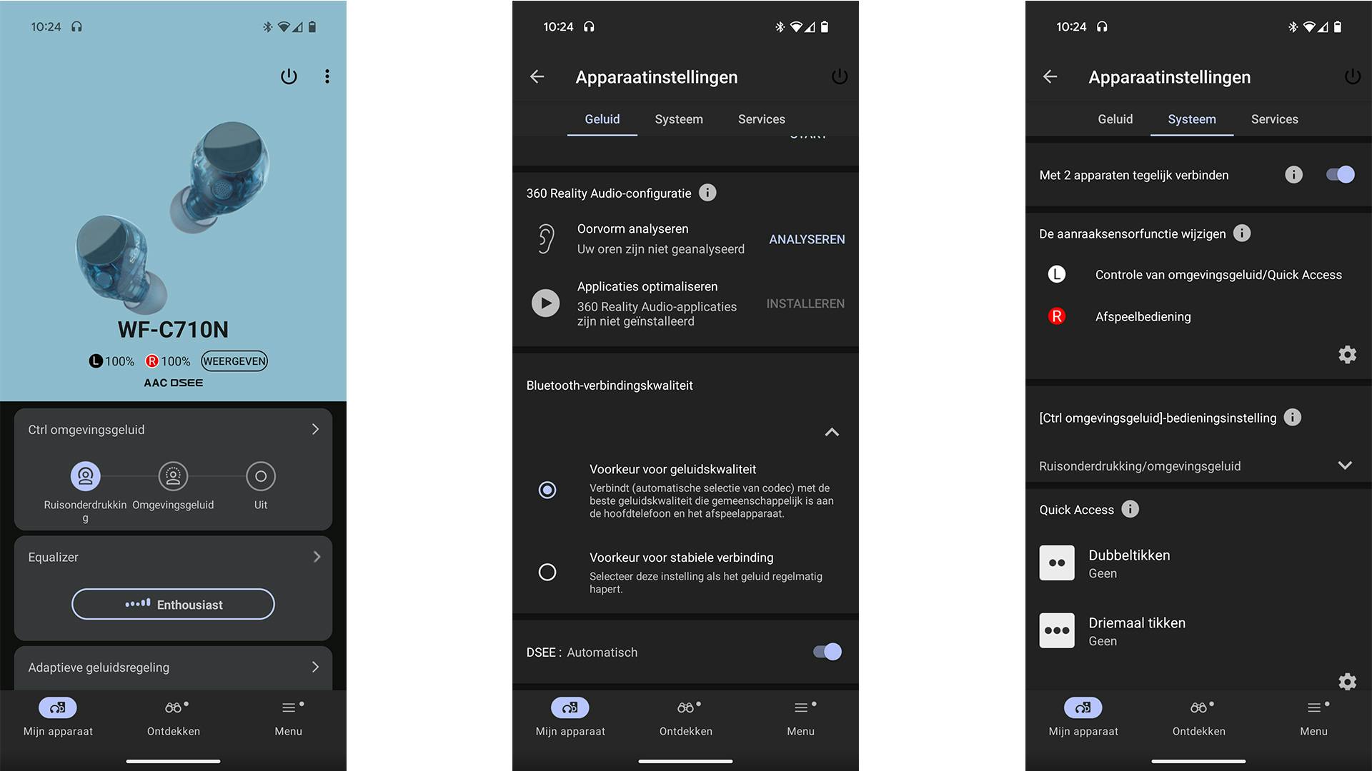 Binnen de app tref je verschillende opties aan voor het versterken of aanpassen van het geluid. Er zijn allerlei presets, waarvan Enthousiast nog steeds onze favoriet is, evenals een handmatig in te stellen equalizer. Koppel dat aan de eerdergenoemde DSEE-basis en je houdt een over het algemeen zachte, warme weergave over. Hogere tonen kunnen hier en daar wat afgemeten klinken, maar we hebben niet het idee dat we echt iets missen tijdens het luisteren. Zeker niet als we ondertussen werken, in de trein of bus zitten of over straat lopen. Dit klinkt gewoon goed.