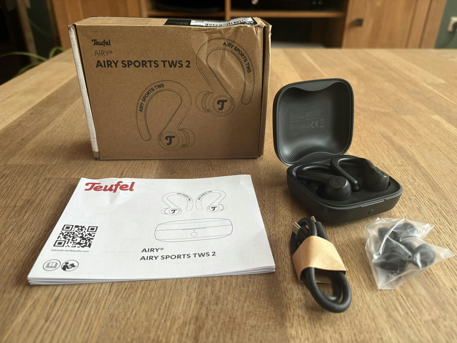 De Berlijnse audiospecialist heeft aan het uiterlijk van de Teufel Airy Sports TWS 2 niet veel veranderd. Het door ons geteste zwarte model bevat aan de buitenzijde van elk oordopje een iets onopvallender Teufel-logo. Daarnaast zijn de oorhaken iets korter en zitten de magneetpunten op een andere plek. Via deze magneetpunten laden de ingebouwde accu's op. De opbergcase heeft zelf ook een accu met een capaciteit van 750 mAh. Die kun je met de inbegrepen usb-c-kabel bijladen. Helaas is dit snoertje met een lengte van nog geen dertig centimeter erg kort.