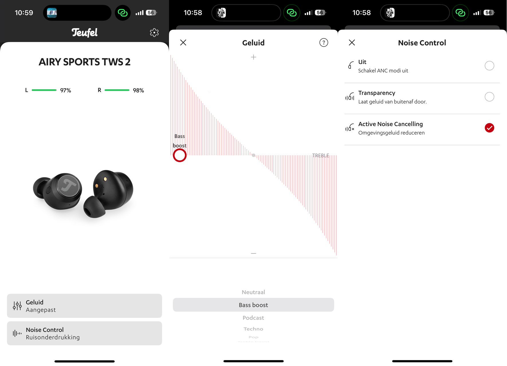 Gebruikers kunnen in de app ook nog noise cancelling of de transparantiemodus activeren. Laatstgenoemde functie laat geluid van buitenaf door, zodat je tijdens het luisteren soepel een gesprek kunt voeren. Verder toont de app de resterende batterijcapaciteit van elk oordopje en de huidige firmware-versie. Als er een nieuwe software-update verschijnt, kun je die meteen installeren.