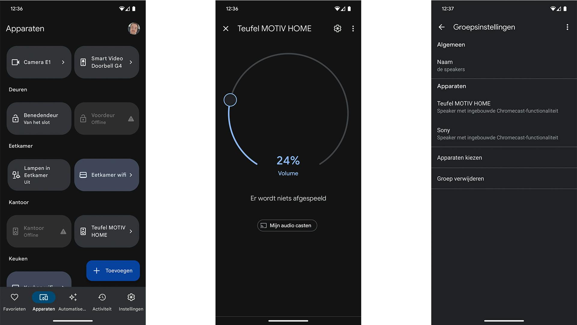 Over die die app gesproken, dat is één van de vier manieren waarop je de Teufel Motiv Home bedient. Binnen de app tref je basale afspeelfuncties aan, evenals de opties met betrekking tot audio. Het is allemaal niet ontzettend uitgebreid, dus verwacht geen equalizer die je helemaal zelf kunt afstemmen. Dat geeft niet, omdat er dus andere opties beschikbaar zijn. Verder kun je de speaker bedienen via Google Home of AirPlay 2, en natuurlijk via de app van de muziekstreamingdienst die je gebruikt. Bovendien kun je de speaker opnemen in een groep, via apps als Google Home.