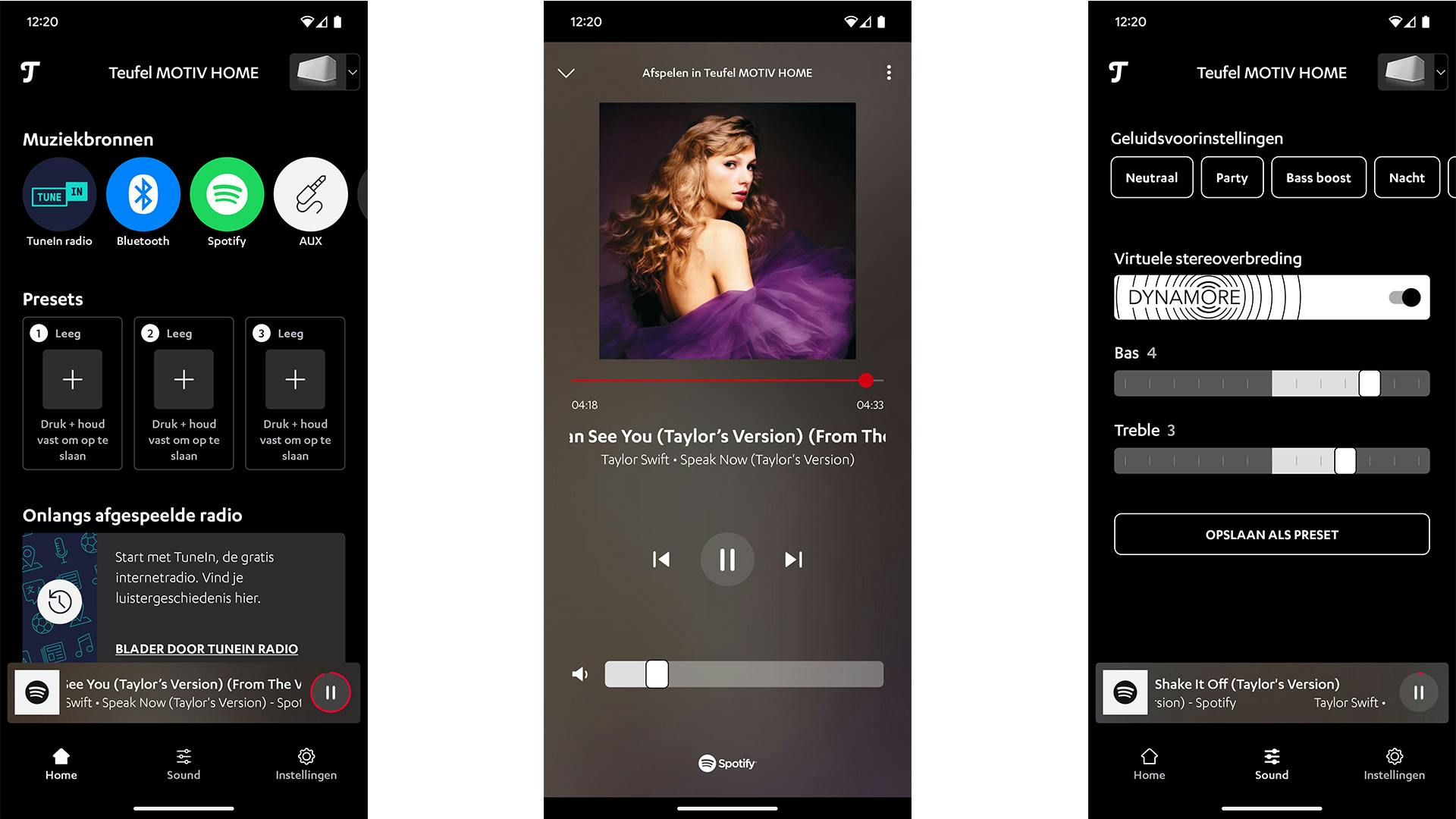 Dat is – moeten we er eerlijk bij vermelden – ook weleens anders. Vooral de audioproducten met wat kleinere luidsprekers profiteren niet volop van deze Dynamore-audiotechnologie, omdat ze simpelweg het bereik er niet voor hebben. Aangezien de Teufel Motiv Home genoeg ruimte aanbiedt voor flinke luidsprekers, hebben we daar hier geen last van. De audio klinkt aangenaam helder en warm waar de tonen warm moeten zijn. Via de app kun je zowel de bas als de treble nog verhogen of verlagen, en eventueel andere presets activeren die bij je smaak passen.