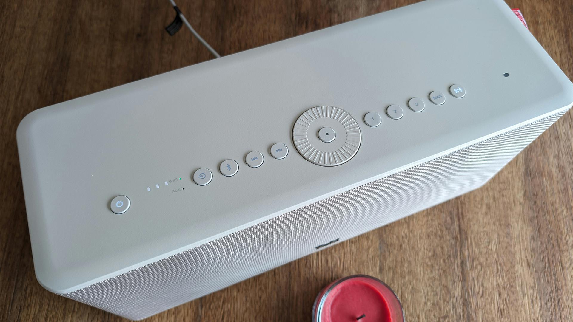 Bovenop de speaker zitten nog wat handige knoppen. Niet alleen kun je de muziek daarmee pauzeren, naar een volgend of vorig nummer gaan, of van bron wisselen, ook kun je een favoriete playlist of radiostation opstarten zonder dat daar een app aan te pas komt. Oké, je moet je voorkeur nog wel even via de app instellen, maar vanaf dat moment bereik je die lijst of dat station met een druk op een van de drie voorkeursknoppen. Verder is het tof dat je het volume bedient middels een draaiwiel. Zo’n wiel is niet bijzonder, maar geeft toch net wat meer gevoel van controle.