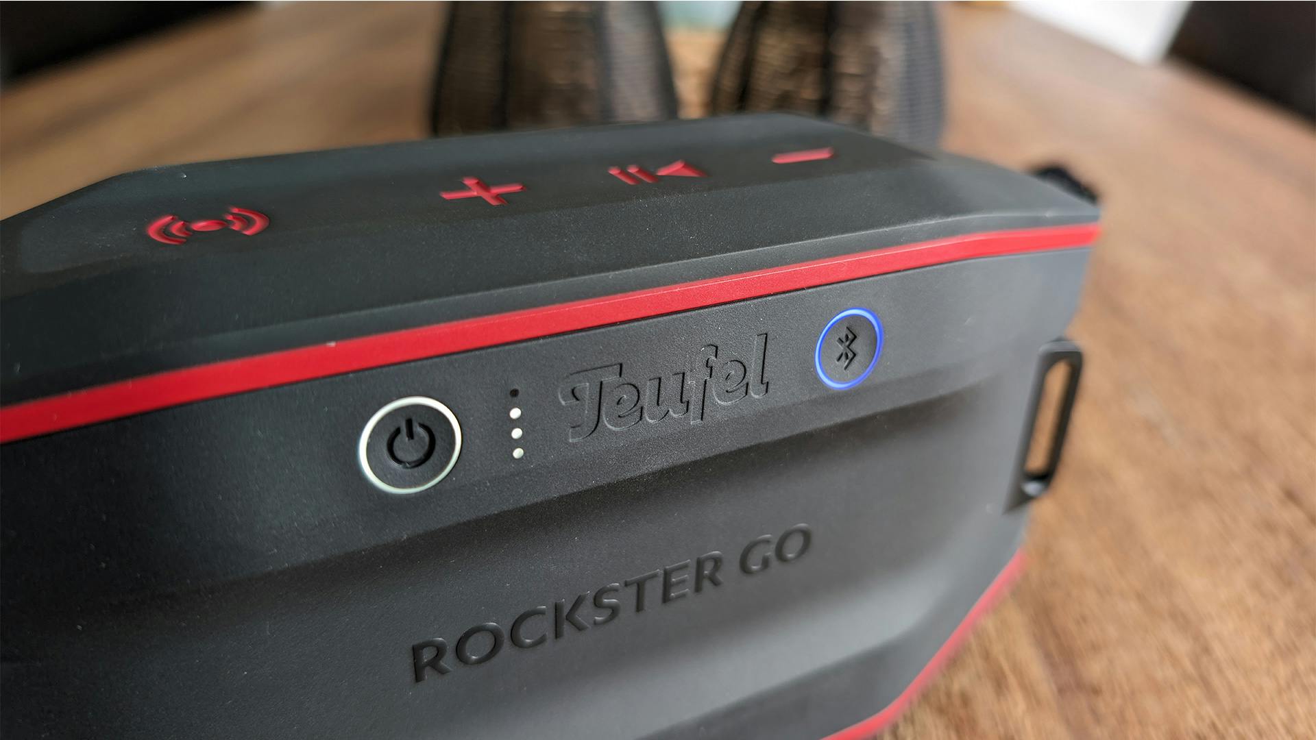 Naast de aansluitingen heeft Teufel niet zoveel veranderingen doorgevoerd aan het design van de Teufel Rockster GO 2. Bovenop zitten nog altijd de bedieningsknoppen, die dit keer van een andere kleur voorzien zijn. Dat geeft de bluetoothspeaker niet alleen meer karakter mee, het is ook nog eens ontzettend handig. Want je ziet zo veel beter wat je doet. In ons geval zijn de knoppen rood, maar je kunt ook kiezen voor grijs (of zwart, dan vallen ze minder op …).