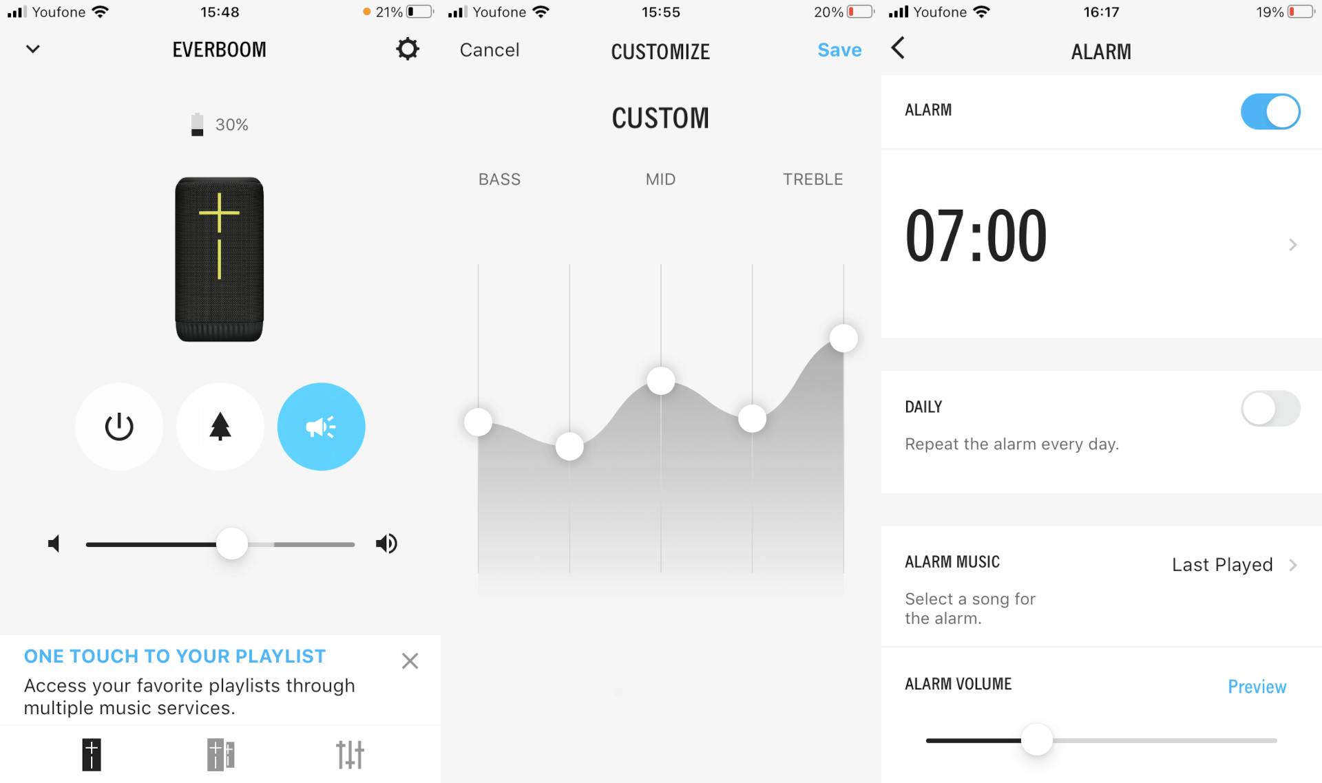 Een andere nuttige optie is dat je de equalizerinstellingen kunt aanpassen. Veeg de schuifknoppen om de bas, het middengebied en de hoge tonen te wijzigen. Je hoort tijdens het luisteren direct het verschil. Ben je tevreden over het geluid, dan sla je het audioprofiel op. Verder heeft de app ook diverse voorgekauwde geluidsinstellingen, bijvoorbeeld om stemmen van podcasts te versterken. Er is ook nog een optie om meerdere Ultimate Ears-speakers aan elkaar te koppelen voor een grootser geluid. Tot slot gebruik je de Everboom desgewenst als wekker. De app is jammer genoeg Engelstalig.