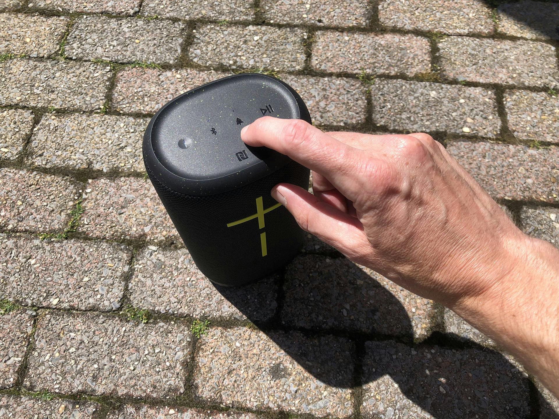 Zoals we van eerdere Ultimate Ears-producten gewend zijn, heeft ook dit exemplaar twee forse volumeknoppen. Als je deze toetsen tegelijk indrukt, tonen kleine ledlampjes de resterende accutijd. Ga bij een volgeladen batterij uit van een speeltijd van ongeveer twintig uur. Bovenop bevindt zich een klein bedieningspaneel. Verder heeft de achterkant nog een lus voor de bijgesloten karabijnhaak en een usb-c-poort. Deze aansluiting bevindt zich achter een rubberen klepje.