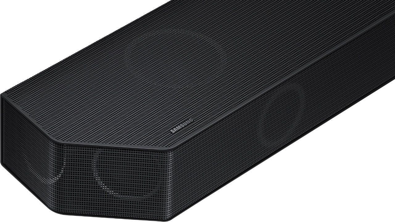 De soundbar zelf is een grote rechthoek die past bij een 55-inch tv. Dankzij zijn zwarte metalen behuizing zonder opvallende elementen komt de HW-Q990B heel bescheiden en onopvallend over. Het design wijkt wel af van de klassieke balkvorm omdat de voorste hoeken afgesneden zijn. Deze schuine kanten maken hem visueel boeiender én huizen speakertjes die geluid heel breed de kamer in sturen.