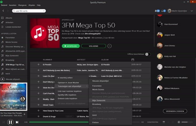 Om dit te doen, start je een nieuwe afspeellijst door in het linkerdeelvenster te klikken op Nieuwe afspeellijst. Vervolgens zoek je in Spotify naar de afspeellijst waarvan de inhoud je bevalt, selecteer je alle nummers (Shift ingedrukt houden) en sleep je ze naar de afspeellijst die je zojuist hebt aangemaakt. Het voordeel hiervan is dat je de afspeellijst daarna uiteraard zelf kunt aanpassen. Dit is veel sneller dan wanneer je hem zelf vanaf de grond af moet opbouwen! Ook handig: in Spotify kun je je afspeellijsten ordenen. Wanneer je met de rechtermuisknop klikt op een leeg gebied onder het kopje Afspeellijsten en daarna klikt op Map aanmaken, dan kun je je lijsten eenvoudig in mappen indelen zodat het niet zo'n onoverzichtelijk rommeltje wordt.