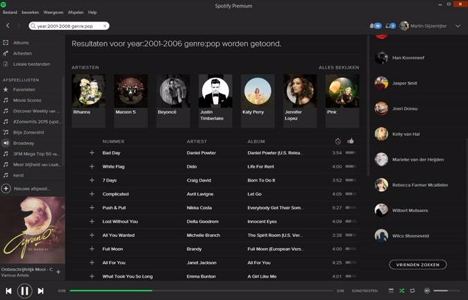 Dat je in Spotify het zoekveld kunt gebruiken om het liedje te vinden waarnaar je op zoek bent, is vast geen nieuws voor je. Maar wist je dat het zoekveld allerlei handige opties biedt zodat je efficiënter kunt zoeken? Zo kun je bijvoorbeeld heel gericht zoeken naar popmuziek in de periode tussen 2001 en 2006, om maar eens wat te noemen. De zoekfunctie die daarbij hoort is year:2001-2006 genre:pop. Dat is heerlijk zoeken, omdat je soms niet op zoek bent naar een specifiek liedje, maar een specifiek gevoel uit een bepaalde tijd. Ben je op zoek naar een bepaalde gebruiker, dan zoek je op user:gebruikersnaam. Zo wordt de zoekmachine van Spotify ineens een stuk krachtiger!