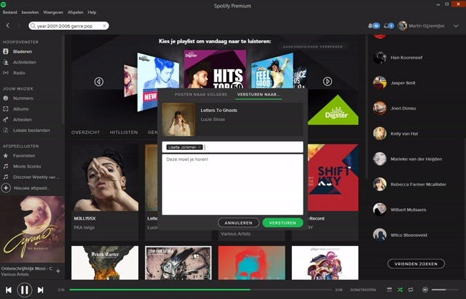 Net als in de échte wereld is het natuurlijk niet netjes om alleen maar te consumeren, het is wel zo sociaal om leuke muziek ook met anderen te delen. Er zijn verschillende manieren om dat te doen. Wanneer je een nummer aan het luisteren bent dat je mooi vindt en onder de aandacht van een vriend of vriendin wilt brengen, dan kun je met de rechtermuisknop op dat nummer klikken en kiezen voor Delen. Vervolgens kun je ervoor kiezen om je muziektip te posten naar iedereen die je volgt, maar je kunt het ook versturen naar specifieke vrienden door bovenin te klikken op Versturen naar. Dit werkt overigens niet alleen voor nummers, je kunt ook complete afspeellijsten op deze manier delen.