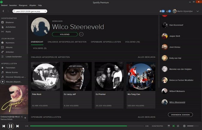 Spotify is eigenlijk zélf geen sociaal netwerk, maar omdat Facebook er behoorlijk diep in is geïntegreerd, voelt en functioneert het vaak wel zo. Wanneer je je Facebook koppelt aan Spotify (dit kun je doen in Bewerken / Voorkeuren / Facebook), krijg je automatisch een overzicht van welke Facebook-vrienden ook gebruikmaken van Spotify. Om dat overzicht op een later tijdstip nog eens te zien, klik je links op Activiteiten (onder Hoofdvenster) en vervolgens op Alles bekijken. Je kunt vrienden niet toevoegen zoals op Facebook, maar je kunt er wel voor kiezen om ze te volgen (dus eigenlijk meer zoals bij Twitter). Rechtsboven zie je nu ook wat voor activiteiten de mensen die je volgt op Spotify ontplooien. En dat is wederom een handige manier om nieuwe muziek te ontdekken (of erachter te komen dat je vrienden wel een héle slechte muzieksmaak hebben).