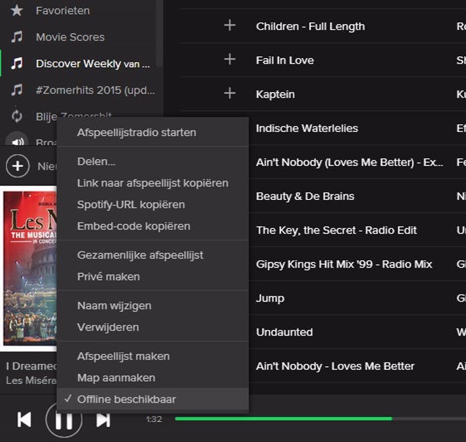 Het klinkt natuurlijk onwerkelijk dat Spotify je de mogelijkheid biedt om de beschikbare muziek te downloaden, maar toch is dat écht zo. Althans, een beetje ... want je downloadt de nummers alleen voor tijdelijk gebruik in het programma zelf. Dit is een fantastische optie wanneer je bijvoorbeeld een paar uur in een vliegtuig zit of op een andere locatie waar je geen internet hebt. Om offline van je favoriete muziek te genieten, rechtsklik je op de afspeellijst van je keuze en klik je vervolgens op Offline beschikbaar. Op je smartphone maak je de muziek offline beschikbaar door een afspeellijst te openen en bovenin de schakelaar bij Offline beschikbaar in te schakelen. Let op, deze functie is niet zonder beperkingen. Je kunt muziek maximaal 30 dagen achtereen offline beschikbaar maken en met een maximum van 3333 nummers.