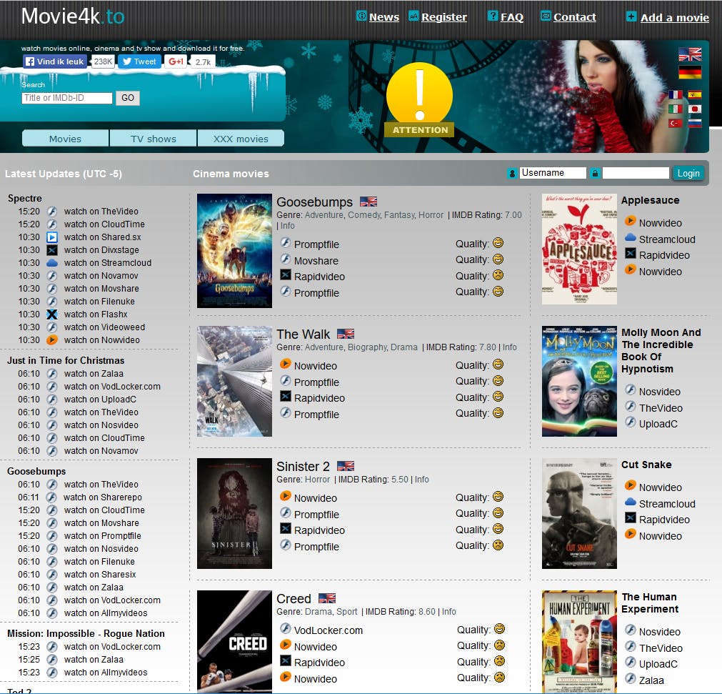 Movie4k houdt het al jaren vol als illegale aanbieder van nieuwe films en series. Bijna alle internationale titels zijn er te vinden. Houd er wel rekening mee dat de videokwaliteit niet is om over naar huis te schrijven, ondanks de naam van de site. Bovendien vind je op de pagina’s behoorlijk wat reclame en werken niet alle films even goed. Daarnaast is het vanwege de drukke interface nog een hele kunst om de juiste weblink te vinden voor het kijken van een film. Wie een beetje moeite doet, komt daar wel uit. Movie4k bewaart overigens zelf geen video’s op de eigen servers, want de website verwijst bij iedere film door naar andere streamingsites.