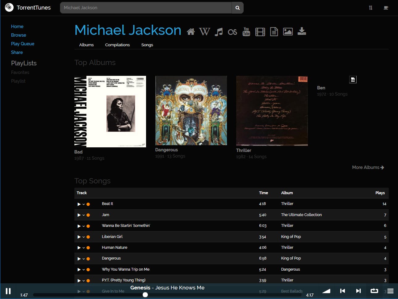 Net als Aurous is TorrentTunes voornamelijk bedoeld voor het streamen van muziek. Alle nummers die je in TorrentTunes vindt, komen rechtstreeks uit het bittorrent-netwerk. Bij deze dienst hoef je geen tooltje te gebruiken om muziek te luisteren, want het werkt rechtstreeks vanuit je browser. Je typt de naam van een artiest, nummer of album in de zoekbalk en TorrentTunes gaat voor je op zoek in verschillende torrent-websites. Het is met TorrentTunes niet mogelijk om afzonderlijke mp3’tjes te downloaden, want de muziek wordt rechtstreeks in je browser afgespeeld. Verder kun je ook eigen playlists maken. Er is een breed aanbod maar er zijn weinig artiesten van Nederlandse bodem te vinden.