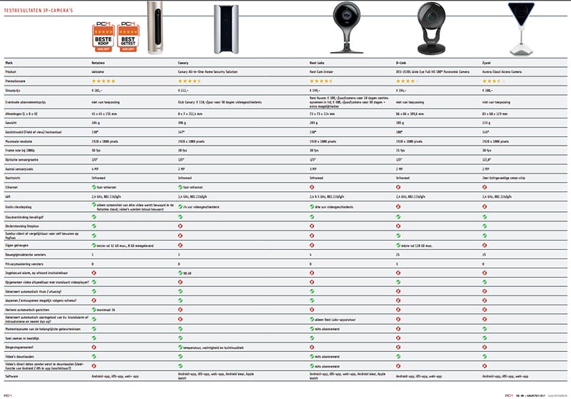 Zijn alles-in-één, cilindervormige design heeft de Canary gemeen met de Netatmo Welcome (zie verderop). Dit in wit of zwart verkrijgbare bewakingszuiltje is wel iets groter en zwaarder dan de Welcome, maar het design blijft heel discreet. Dat dit een bewakingscamera is, valt de toevallige bezoeker wellicht niet meteen op. Je kunt tot vier Canary’s in één locatie gebruiken. Die slaan hun bewakingsbeelden allemaal online op. Beelden van de afgelopen 24 uur zijn gratis raadpleegbaar. Om tot dertig dagen terug te gaan, moet je maandelijks 9,99 euro betalen.