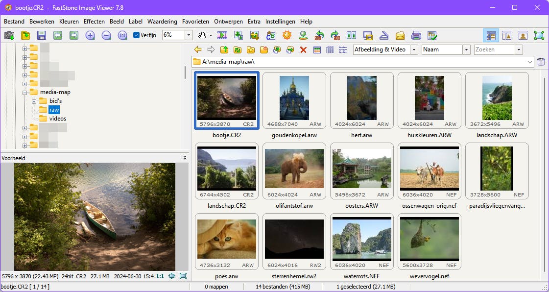 Is het je alleen te doen om een eenvoudige viewer voor raw-foto’s? Dan kun je onder meer kiezen voor de gratis Image Raw.Viewer (Microsoft Store), FastStone Image Viewer of IrfanView (met plug-in Camraw). Om raw-foto’s als voorafbeeldingen in Windows Verkenner te bekijken, kun je eventueel de Microsoft Raw Image Extension (Microsoft Store) installeren.