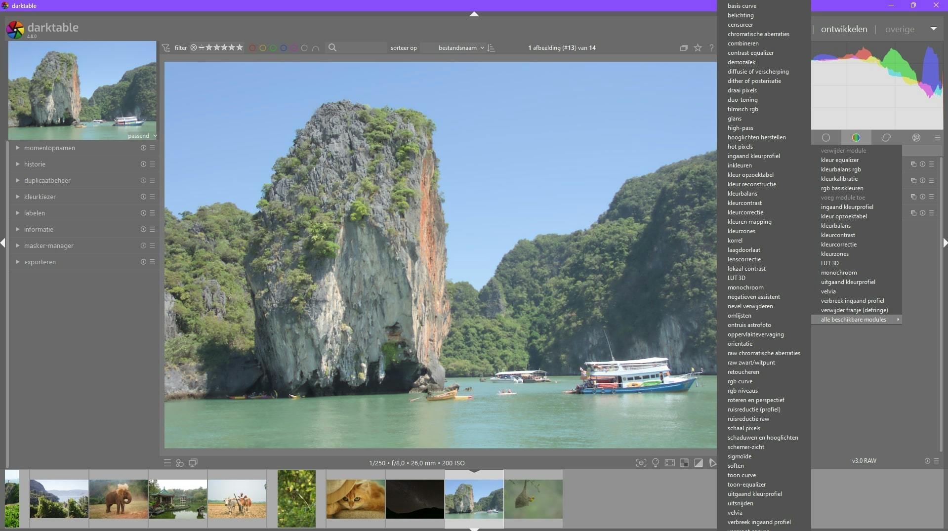 Er zijn in totaal zestig onderdelen beschikbaar. Maak ze zichtbaar door met rechts op een van de knoppen onder het histogram te klikken en Alle beschikbare modules te selecteren.