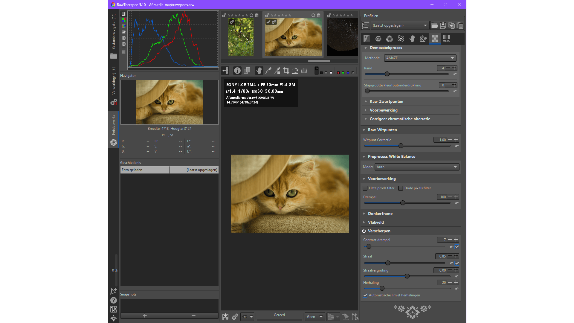Via de knoppenbalk in het rechterdeelvenster krijg je toegang tot diverse modules, waaronder RAW. Deze knop biedt geavanceerde opties om de oorspronkelijke gegevens van het raw-bestand te optimaliseren, bij voorkeur voor andere bewerkingen. Je vindt hier opties zoals Demozaïekproces (methodes om de raw-sensorgegevens optimaal weer te geven), Preprocess White Balance (voor betere kleurnauwkeurigheid, dit kun je ook later aanpassen) en Corrigeer chromatische aberratie (correctie van kleurfouten door de lens, vaak als gekleurde randen rond objecten). Na de nodige aanpassingen heb je een solide basis voor verdere bewerkingen onder de knoppen Belichting, Detail en Kleur. Net als darktable maakt ook RawTherapee niet-destructieve sidecar-bestanden aan (met extensie pp3).