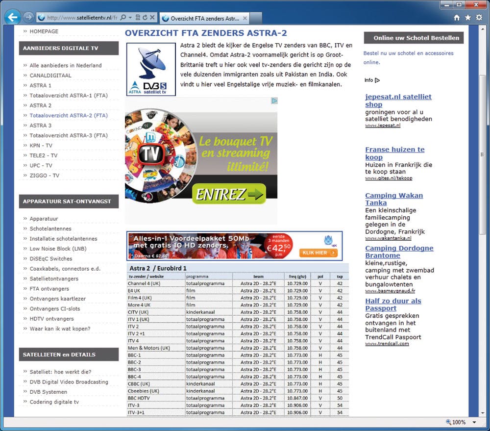 XYZ-technisch gezien kunt u de satellietschotel naar alle kanten laten wijzen. Echter, maar één kant is – met een beetje speling – de goede kant. En welke die kant is? Gelukkig kunnen wij ons beperken tot een van de drie Astra-satellieten. Dat zijn (hoe kan het ook anders) de Astra 1, de Astra 2 en de Astra 3. De site www.satellietentv.nl kan u daar nog meer over vertellen, ook onder andere over welke – belangrijke – zenders en kanalen u via welke van die drie Astra’s kunt ontvangen (afbeelding 1). De voor Nederland meest gebruikte Astra-satelliet is de Astra 1 en die zit op 19,2 graden oost. De Astra 2 zit op 28,2 graden oost. De Astra 3 zit op 23,5 graden oost. Let wel, u kunt met een normale satellietopstelling slechts inrichten op één van de drie Astra-satellieten. In ons BBC-geval wordt dat de Astra 2, want daarop zitten alle Engels-georiënteerde zenders en kanalen.