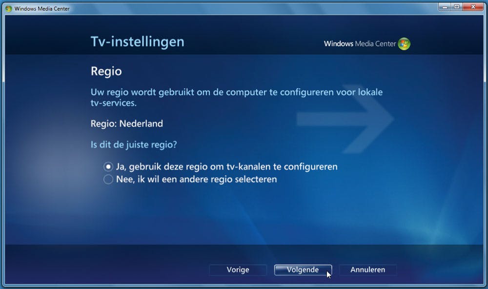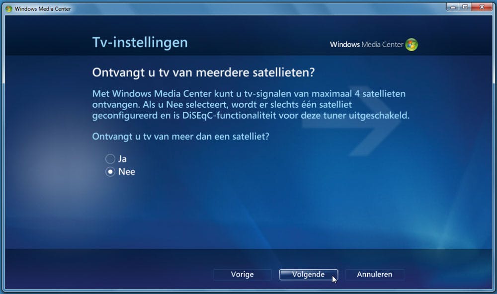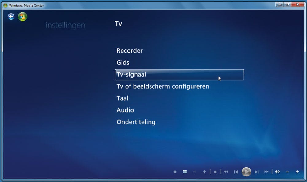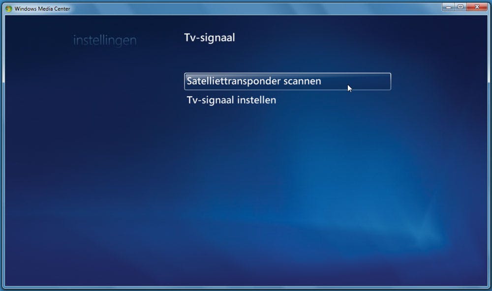 Via de instellingen van het Windows Media Center geven we aan dat we het tv-signaal gaan bewerken. Dat is een eenmalig iets waarvoor u – op een strategisch moment – even een internetverbinding nodig hebt. We gaan eerst het TV-signaal instellen omdat dat bijvoorbeeld nodig is om te vertellen met welke satelliet we aan de slag gaan.