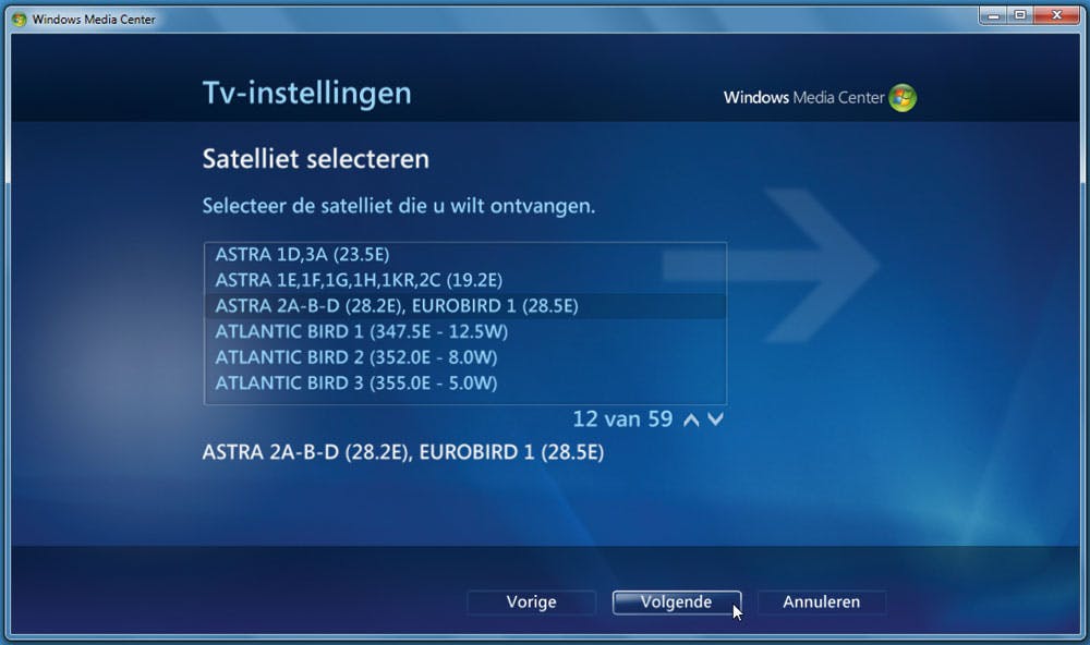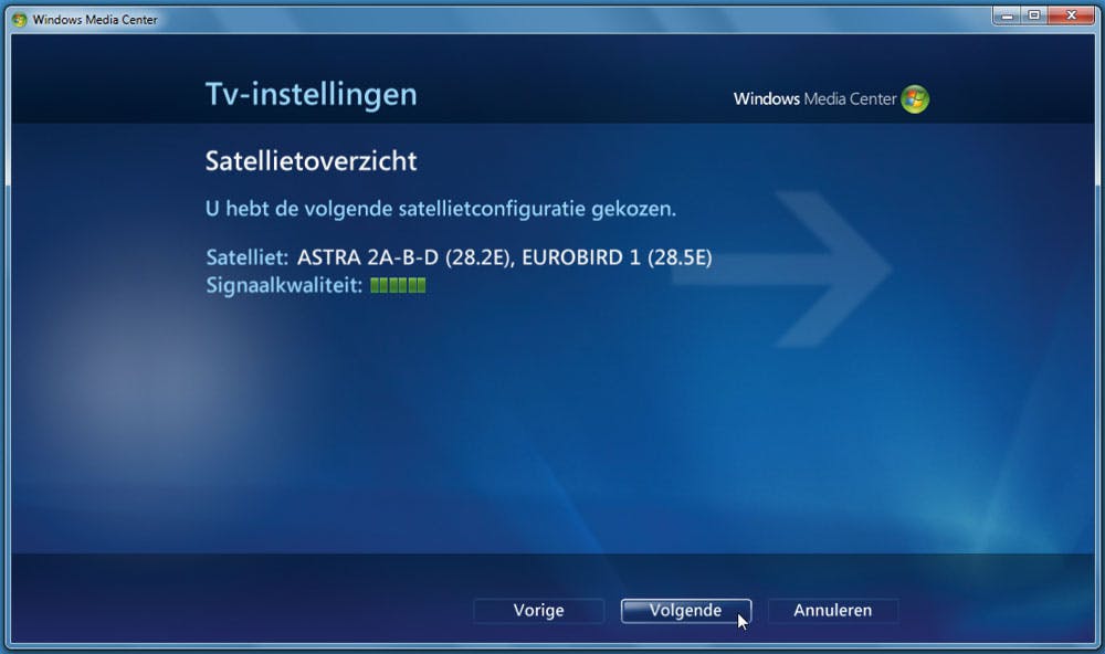 Opgelet! U ziet dat we naar de Astra 2 kijken en dat we een prima signaal hebben. De hier getoonde signaaldetectie kunt u dus óók gebruiken tijdens het richten van de satellietschotel! Met een klik op volgende is het eerste gedeelde van de tv-/satelliet-configuratie voltooid. Het Windows Media Center weet dat het om de Astra 2 gaat en dat is het belangrijkste feit voor nu.