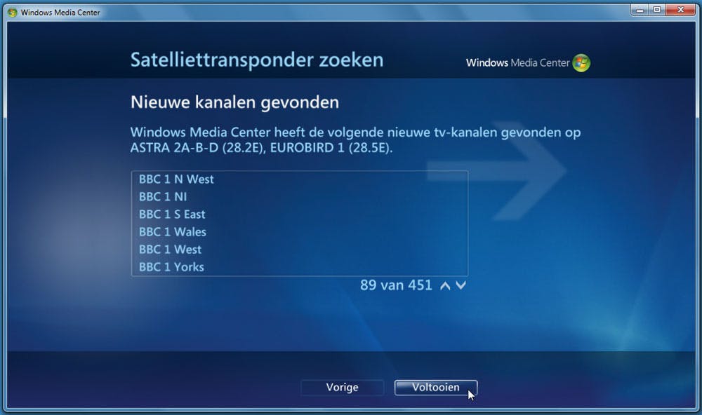 De volgende stap wordt dan het zogeheten scannen van de satelliettransponder. Dat betekent dat het Windows Media Center gaat controleren welke zenders en kanalen er op de Astra 2 zitten. Graag even geduld, want dit gaat – gelukkig eenmalig – wel even een poosje duren.