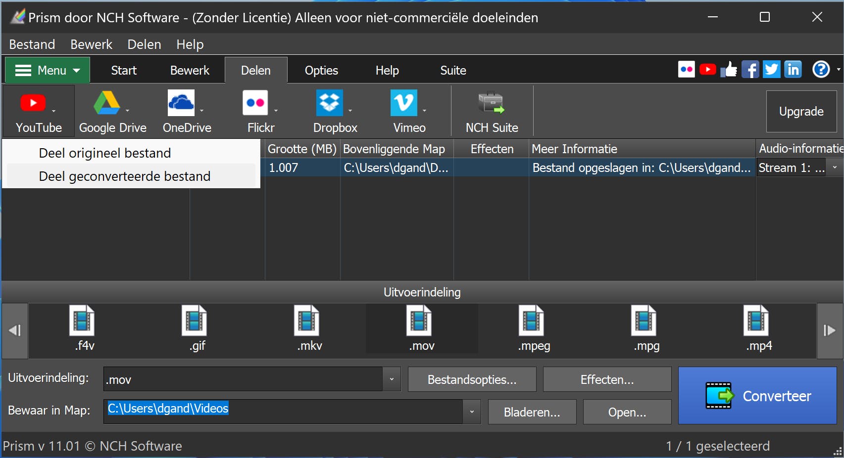 Zodra je de bestanden hebt omgezet, kun je ze uiteraard alleen lokaal opslaan. Je kunt ze ook delen, zie de tab Delen. Vanuit Prism kun je de bestanden delen op je eigen YouTube-kanaal, maar ook via andere sociale netwerken zoals Vimeo. Bovendien kun je de bestanden op een cloudopslag bewaren. Zo is er integratie met Google Drive, OneDrive en Dropbox.