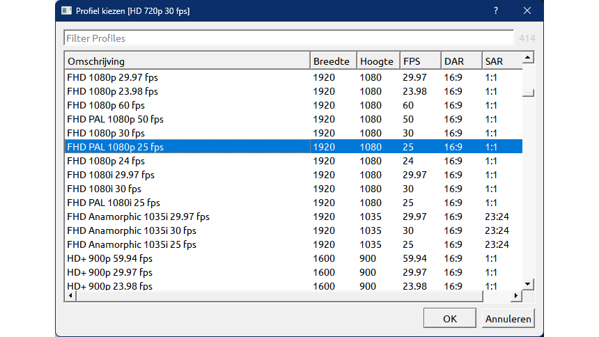 Het projectprofiel van OpenShot is standaard ingesteld op HD 720p 30 fps (frames per second). Hoewel dit voldoende is voor het bewerkingsproces, is het beter om vanaf het begin het profiel te kiezen dat past bij het gewenste eindproduct. Dit kan via Bestand / Profiel kiezen. Er zijn honderden profielen beschikbaar, waarvan in Europa 30 fps (PAL) gebruikelijk is. Wijzelf kiezen FHD PAL 1080p 25 fps (16:9), maar je kunt natuurlijk een ander profiel selecteren. Het is zelfs mogelijk om je eigen profiel aan de lijst toe te voegen, maar dit is nogal bewerkelijk.