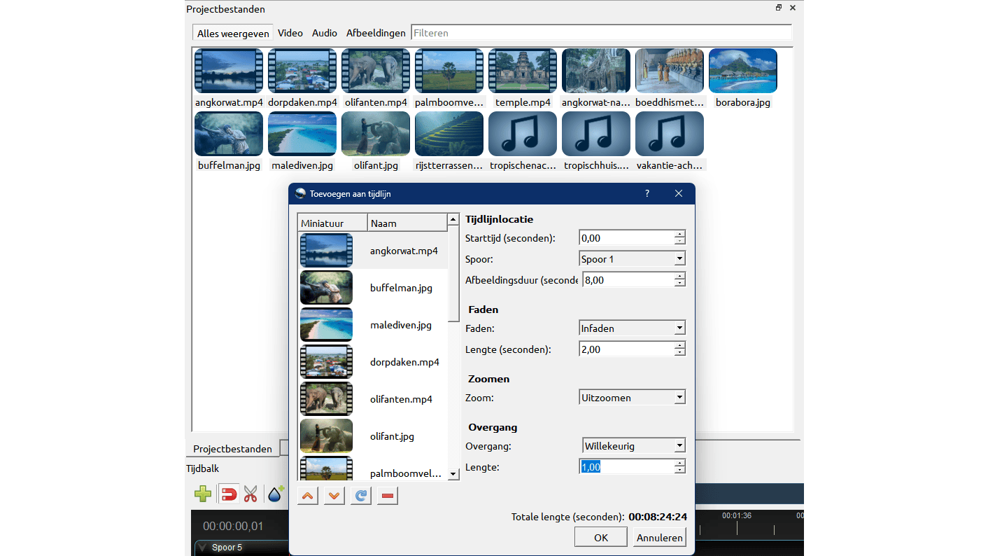 Nu kun je de media in de gewenste volgorde op de tijdlijn plaatsen en je kunt de clips later ook nog op de tijdlijn zelf verplaatsen. Stel de opties Starttijd, Afbeeldingsduur en Spoor in, en geef aan of je wilt faden en/of zoomen, en welke overgang je eventueel wilt gebruiken. Bevestig met OK om je media naar de tijdlijn te kopiëren.