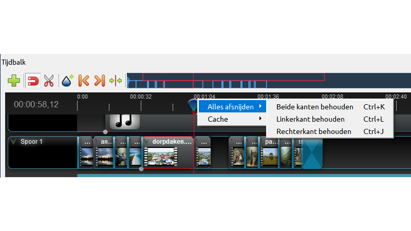 Als je een fragment midden in een videoclip wilt verwijderen, verplaats dan eerst de afspeelknop boven de tijdlijn naar het begin van het ongewenste fragment. Klik met rechts op de clip en kies Afsnijden / Beide kanten behouden. Herhaal dit voor het einde van het fragment. Het fragment wordt nu een afzonderlijke clip die je met de Delete-toets kunt verwijderen.