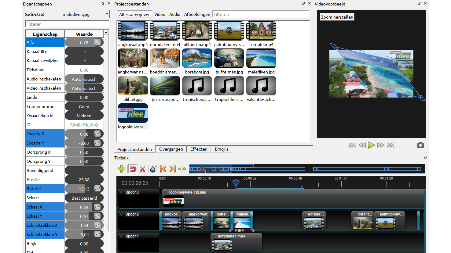 Een andere optie is om het bovenliggende beeld deels doorzichtig te maken. Plaats de afspeelknop boven de clip, rechtsklik erop en kies Eigenschappen. Selecteer de eigenschap Alfa bovenaan en schuif de bijbehorende balk wat naar links, of dubbelklik erop om zelf een waarde in te voeren. Merk ook op dat je vanuit dit venster nog heel wat andere eigenschappen kunt aanpassen.