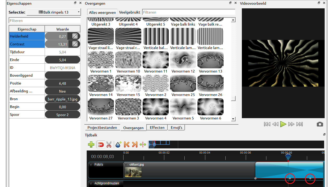 Vanuit het eigenschappenvenster van de overgang pas je onder meer de opties Helderheid en Contrast aan. Het is belangrijk om te weten waar de afspeelknop zich precies bevindt, omdat op dat moment een zogeheten keyframe wordt gemaakt (in OpenShot ook wel key-punt genoemd), waarop je aanpassingen van kracht worden. Met de pijltoetsen kun je één frame tegelijk door je video navigeren.