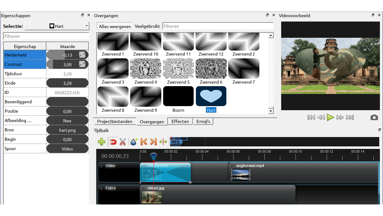 Zolang je niet overdrijft, kan een overgangseffect tussen twee clips wel aardig zijn. Open het tabblad Overgangen en versleep de gewenste overgang tussen twee clips op de tijdlijn, zodat deze beide deels overlapt. Een overgang herken je aan een blauwe rechthoek op de tijdlijn. De duur en positie pas je met de muis aan.