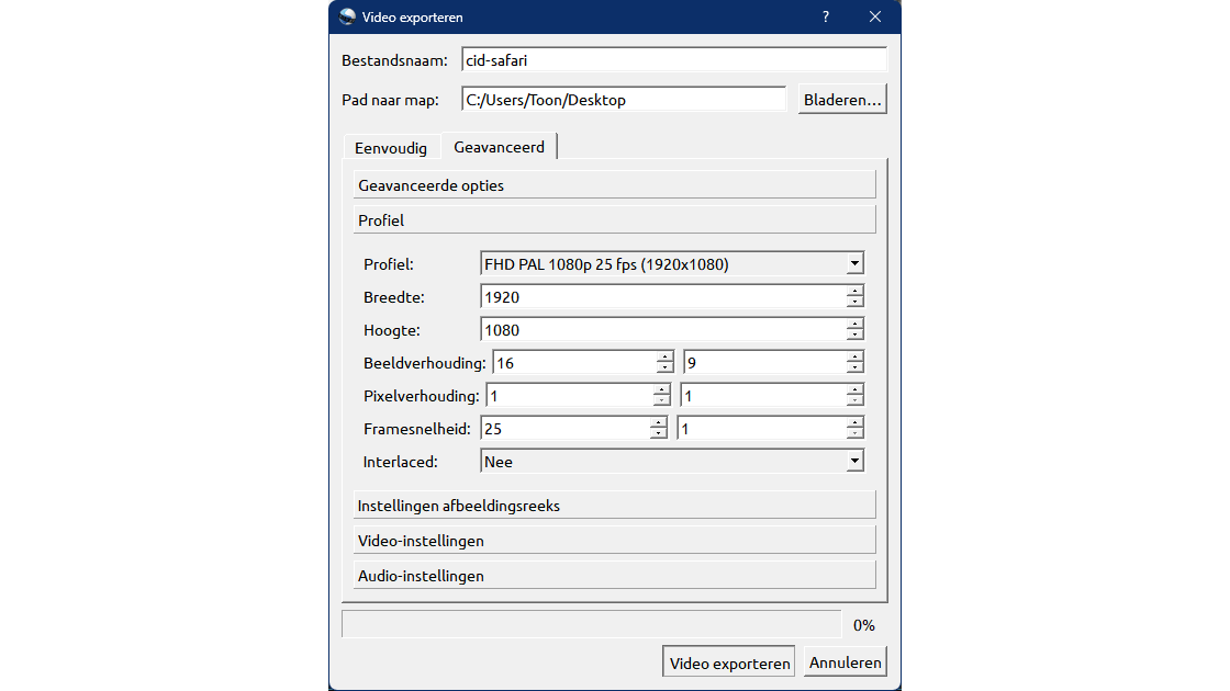 Mocht je niet het optimale videoformaat vinden, open dan het tabblad Geavanceerd. Hier kun je onder andere aangeven welke frames je wilt exporteren en zeer nauwkeurig instellen welke video- en audio-codecs je wilt gebruiken, met opties als Samplesnelheid en Bitsnelheid. Je kunt zelfs het videoprofiel tot in de kleinste details aanpassen, inclusief beeld- en pixelverhouding, en de framesnelheid.