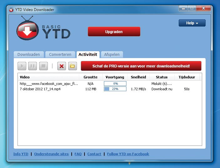 En u raadt het al, deze nieuw gecomponeerde url neemt u mee naar YTD Video Downloader. Wat blijkt? Dan kan het videobestand opeens wél van Facebook worden afgeplukt (zie afbeelding). Daarbij is de downloadsnelheid uiteraard afhankelijk van diverse factoren, zoals de grootte van het videobestand en de internetbandbreedte die u kunt wegzetten. Het resultaat is uiteindelijk het gewenste videobestand dat u offline op de PC kunt afspelen met een mediaspeler. Of misschien gebruikt u het als basismateriaal voor een groter project dat u met behulp van een videobewerkingsprogramma gaat samenstellen? Dat doet er ook niet toe, want eenmaal offline zijn de mogelijkheden opeens weer legio!