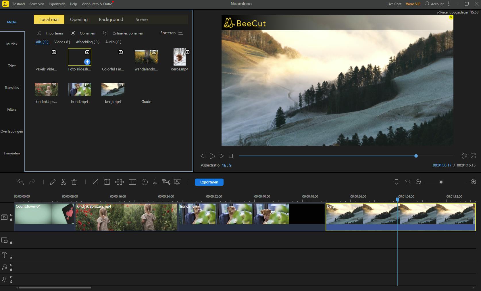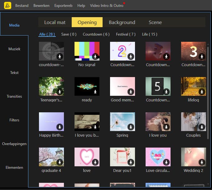 Als je begint, vraagt het programma de gewenste beeldverhouding van het project. De belangrijkste beschikbare verhoudingen zijn 16:9 (breed scherm), 4:3 (traditioneel), 1:1 (Instagram), 3:4 (Taobao) en 9:16 (portret). Daarna importeer je de filmpjes via de tab Media en de knop Importeren. Je kunt ook de mediabestanden gewoon naar dit vak slepen. Overtollige bestanden kun je later verwijderen door erop te klikken met de rechtermuisknop en de opdracht Verwijderen te kiezen. Wanneer je op zo’n miniatuurafbeelding in de bibliotheek dubbelklikt, zal BeeCut deze in realtime afspelen in het voorvertoningsvenster. Het tabblad Media bestaat zelf nog eens uit vier tabbladen waarin materiaal staat dat je in je project mag gebruiken. In de tab Opening vind je een reeks clips die kunnen dienen als intro, Background bevat een collectie achtergronden en Scene heeft een bibliotheek vooraf opgenomen clips waarmee je mag experimenteren. Al dit materiaal staat online. Je moet dus eerst even op het downloadknopje klikken voordat je de clip daadwerkelijk kunt gebruiken.