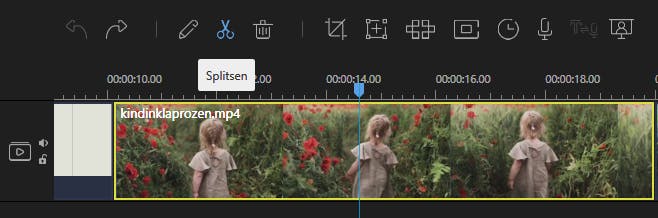 Boven de tijdlijn aan de rechterkant staat een schuifje waarmee je regelt hoe breed die clips in beeld komen. Als je flink inzoomt, kun je nauwkeuriger trimmen. Klik in de tijdlijn eerst op de clip die je wilt trimmen. Daarna sleep je de spoorknop naar de plaats waar je de knip wilt geven. Gebruik het schaartje om de clip te splitsen. Daarna kun je het overbodige deel selecteren en verwijderen door op het vuilnisbakje te klikken. Je kunt ook de Delete-toets gebruiken om een clip of een deel ervan te wissen.