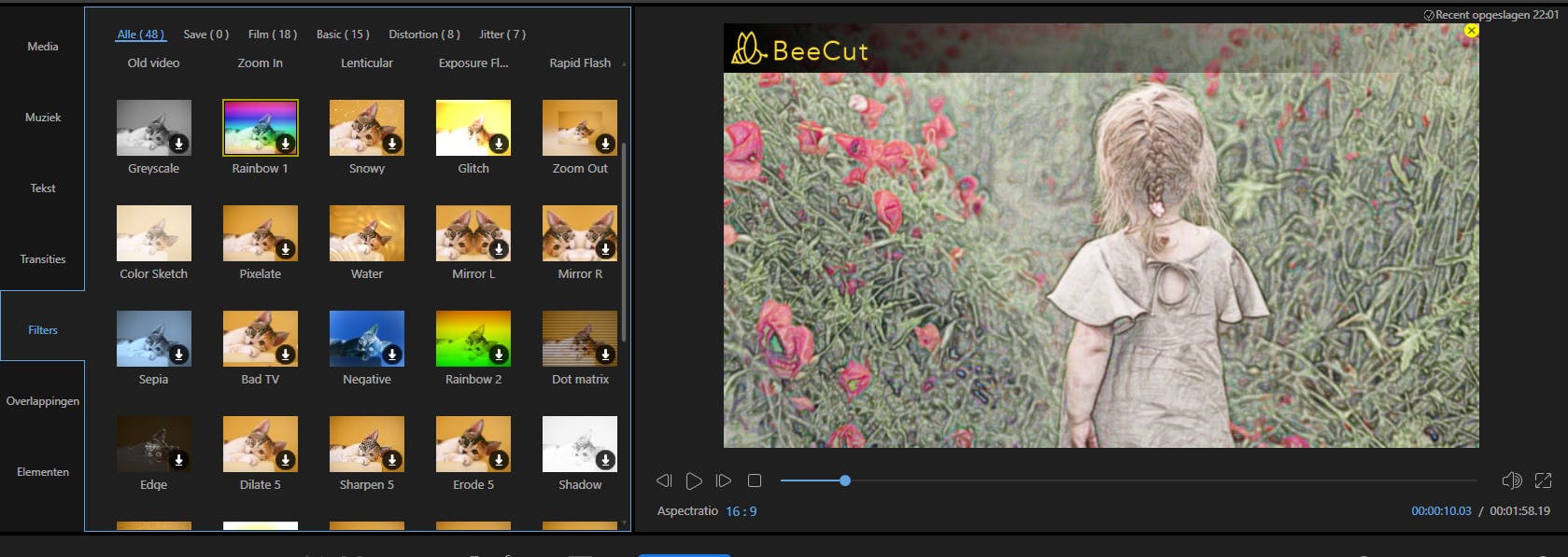BeeCut heeft een set filters die je kunt inladen en daarna toepassen. De 48 filters zijn gegroepeerd in de categorieën Film, Basic, Distortion en Jitter. Uiteraard kun je telkens het resultaat bekijken op het voorvertoningsscherm, maar het is niet mogelijk om de parameters van zo’n filter aan te passen. Onderaan staat het tabblad Elementen. Eigenlijk zijn het 69 animaties waarmee je sneeuwvlokken, vuurwerk, dwarrelende bladeren en sierranden op de geselecteerde clip aanbrengt. De filters en elementen die je toevoegt, verschijnen op een afzonderlijke laag in de tijdlijn.